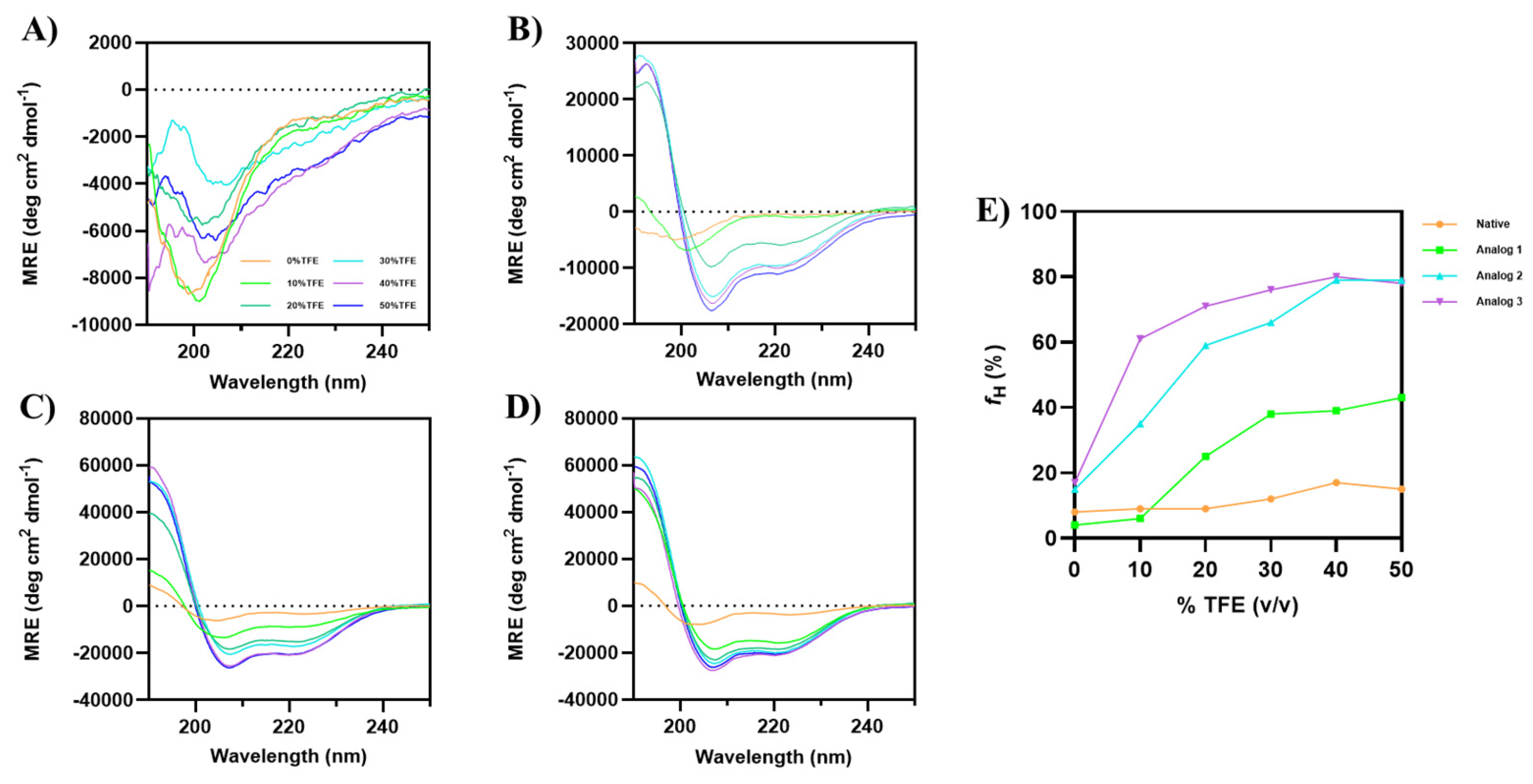 | Peptide | Kd (M) | [θ] Monomer (deg cm2 dmol−1) | [θ] Complex (deg cm2 dmol−1) |