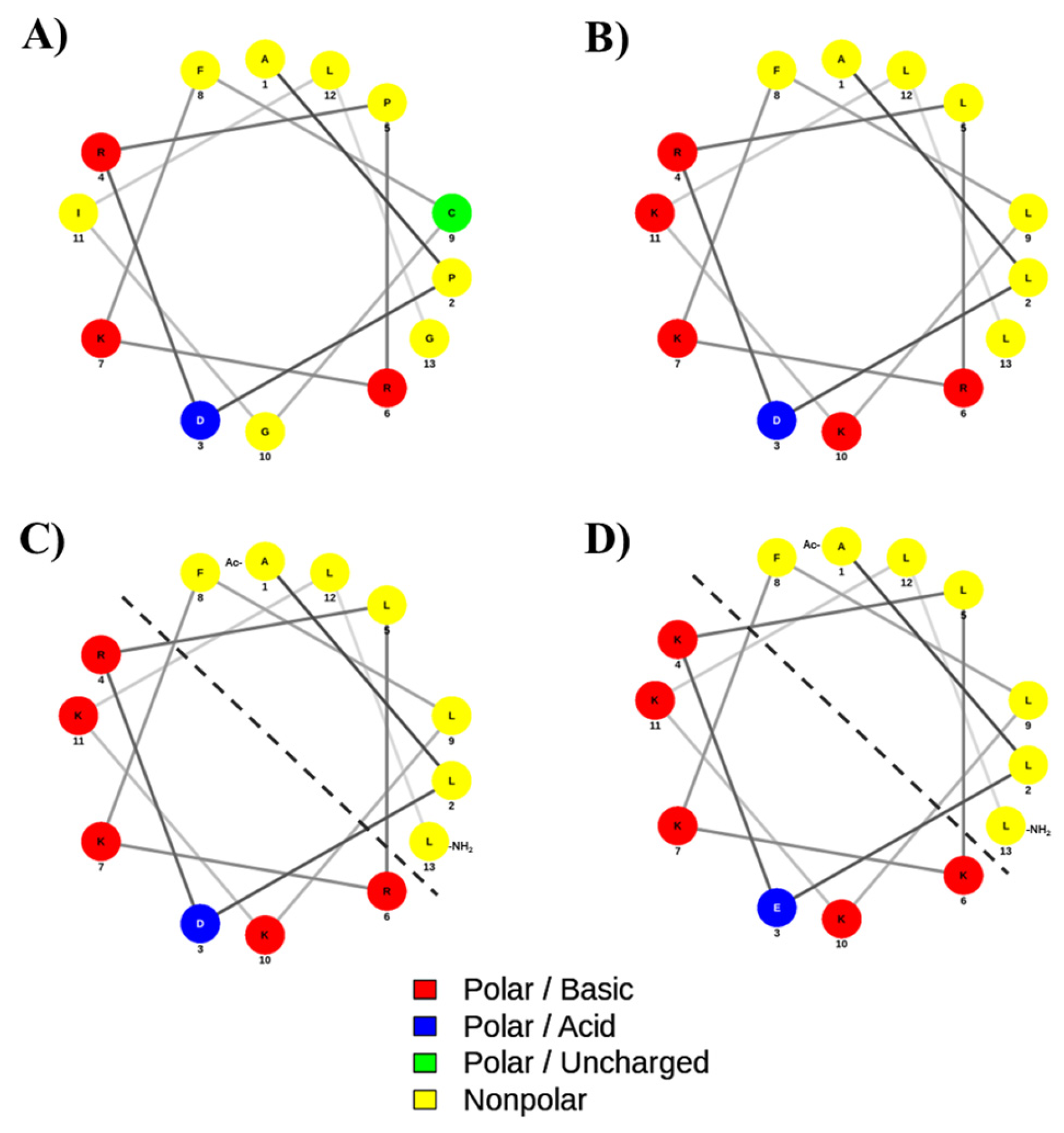 - Huang, Y.; He, L.; Li, G.; Zhai, N.; Jiang, H.; Chen, Y. Role of helicity of α-helical antimicrobial peptides to improve specificity. Protein Cell 2014, 5, 631–642. [Google Scholar] [CrossRef]