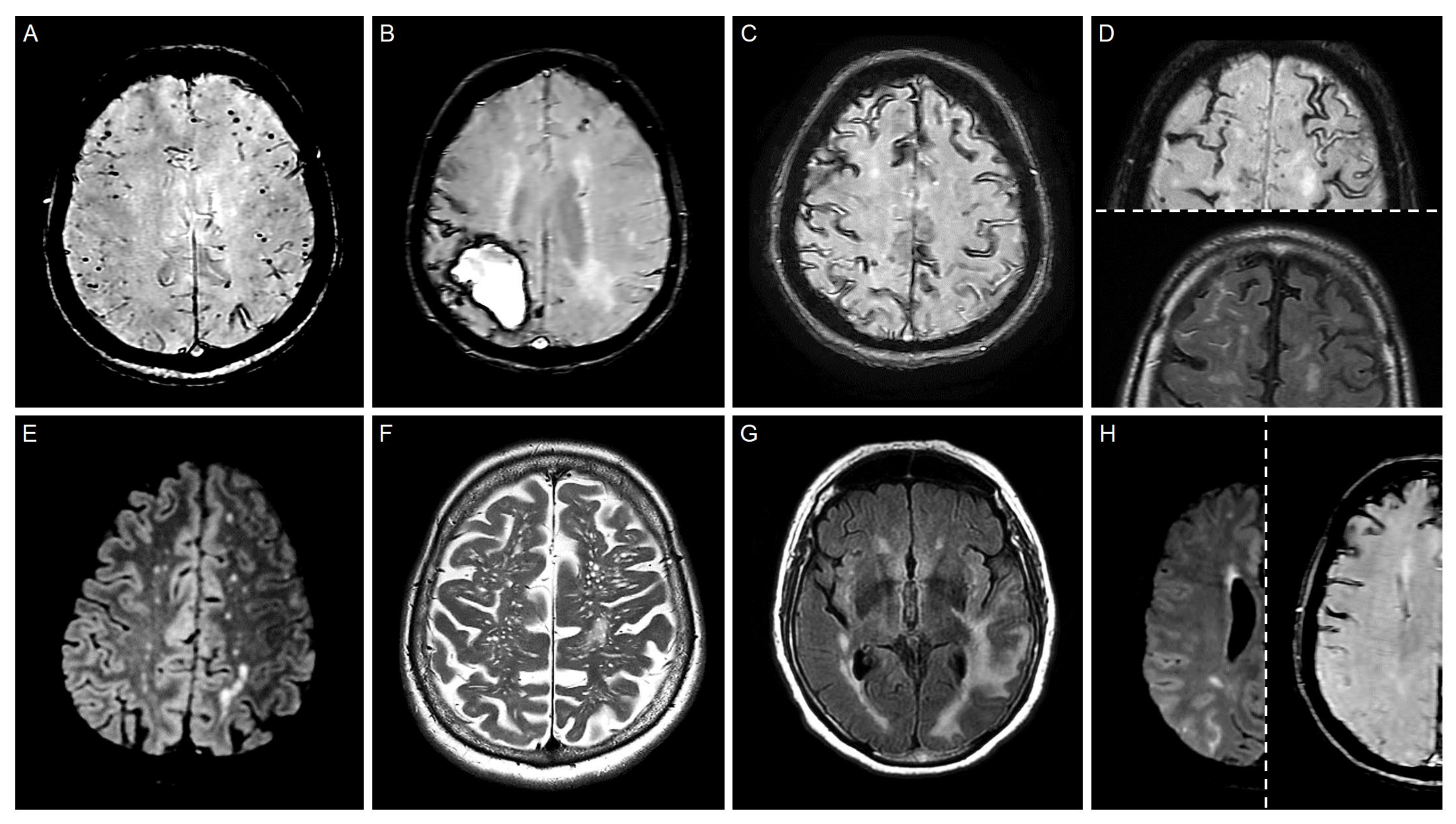 - Greenberg, S.M.; Vernooij, M.W.; Cordonnier, C.; Viswanathan, A.; Al-Shahi Salman, R.; Warach, S.; Launer, L.J.; Van Buchem, M.A.; Breteler, M.M. Cerebral microbleeds: A guide to detection and interpretation. Lancet Neurol. 2009, 8, 165–174. [Google Scholar] [CrossRef] [PubMed]
