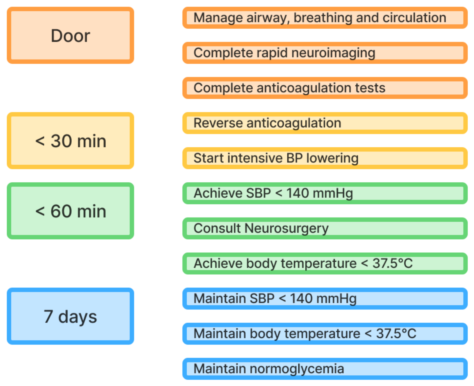 - Parry-Jones, A.R.; Jarhult, S.J.; Kreitzer, N.; Morotti, A.; Toni, D.; Seiffge, D.; Mendelow, A.D.; Patel, H.; Brouwers, H.B.; Klijn, C.J.; et al. Acute care bundles should be used for patients with intracerebral haemorrhage: An expert consensus statement. Eur. Stroke J. 2024, 9, 295–302. [Google Scholar] [CrossRef] [PubMed]