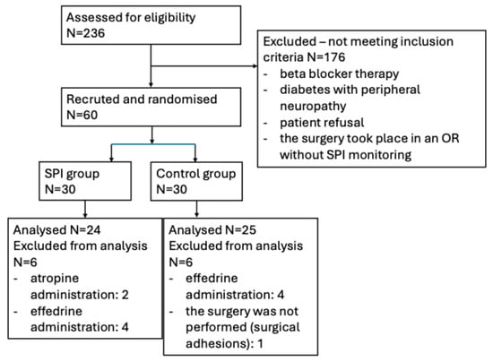 We included 49 patients in the final analysis, 24 in the SPI-guided group and 25 in the control group (Figure 1). There were no differences between the demographical data in the two groups regarding age, height, weight, BMI, gender, ASA score (Table 1). Vital signs as well as SPI recordings are detailed in Table 2. Overall, hemodynamic parameters were similar in both groups. No significant differences at any time point were registered for MAP (all p > 0.05) or HR, though after exsufflation there was a trend toward higher HR in the SPI group, but not significant (p = 0.055). A small trend toward lower SPI was registered in the SPI-guided group during incision and pneumoperitoneum (p = 0.066 and 0.069, respectively), despite SPI values being comparable across groups.