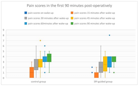 There were no differences regarding opioid consumption and pain scores during the first 90 min postoperatively (Table 3 and Table 4). Fentanyl dose (both absolute value and per LBW) was lower in the SPI-guided group (400 vs. 450 mcg and 7.54 ± 1.09 vs. 6.93 ± 1.52 mcg), but not statistically significant (p = 0.1). There was a statistically different time to wake-up between the groups of approximately 1 and 1/2 min (8.1 vs. 9.6 min, p < 0.001) and we also found more hemodynamic events (28% vs. 8.3%, p = 0.07), as well as a higher need for rescue analgesia (36% vs. 16.7%, p = 0.12) in the first 90 min postop in the control group, even if not statistically different. Pain scores in the first 90 min in the PACU are shown in Figure 2. In all the patients the duration of surgery was between 90 and 120 min, from induction to wake-up.