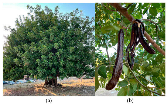 Carob (Ceratonia siliqua) is native to the Mediterranean region and mainly found in Italy, Spain, Greece, Portugal, and Morocco [2]. The carob tree (Figure 1a) is an evergreen xerophytic species belonging to the Fabaceae family that produces large pods (Figure 1b). Its resilience to drought, poor soils, and harsh climatic conditions makes it an essential crop in the fight against desertification [1].