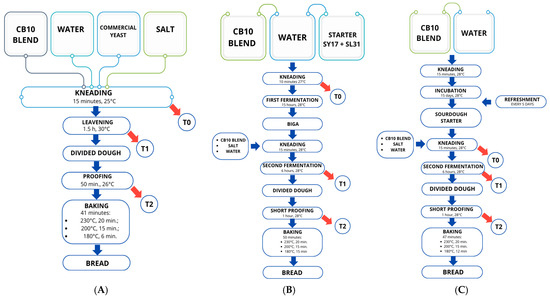 Breadmaking flowcharts. (A): direct method with commercial yeast (LB); (B): indirect method with selected sourdough starter (LI); (C): indirect method with sourdough starter (LS); and dough sampling scheme.