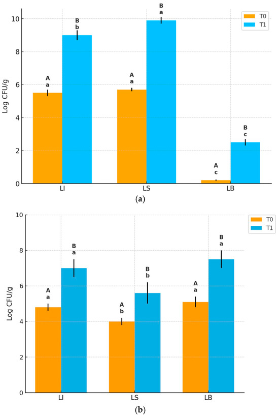 As shown in Figure 3, at T0, LAB counts were similar in LI and LS (~5.6–5.9 log CFU/g, while LAB in LB were undetectable. After fermentation (T1), LAB counts significantly increased in LI (9 log CFU/g) and LS (10 log CFU/g), with LS reaching significantly higher levels than LI; LAB in LB also increased but remained low (~2 log CFU/g).