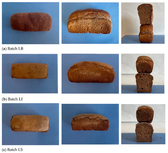 The different experimental breads (LB, LI, and LS), produced using the CB10 blend, are presented in Figure 4.