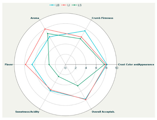 The radar chart in Figure 5 highlights the different degrees of consumer preference for the three bread batches (LB, LI, and LS), which are consistent with their physicochemical, colorimetric, physical, and textural characteristics, the last two of which are discussed below.