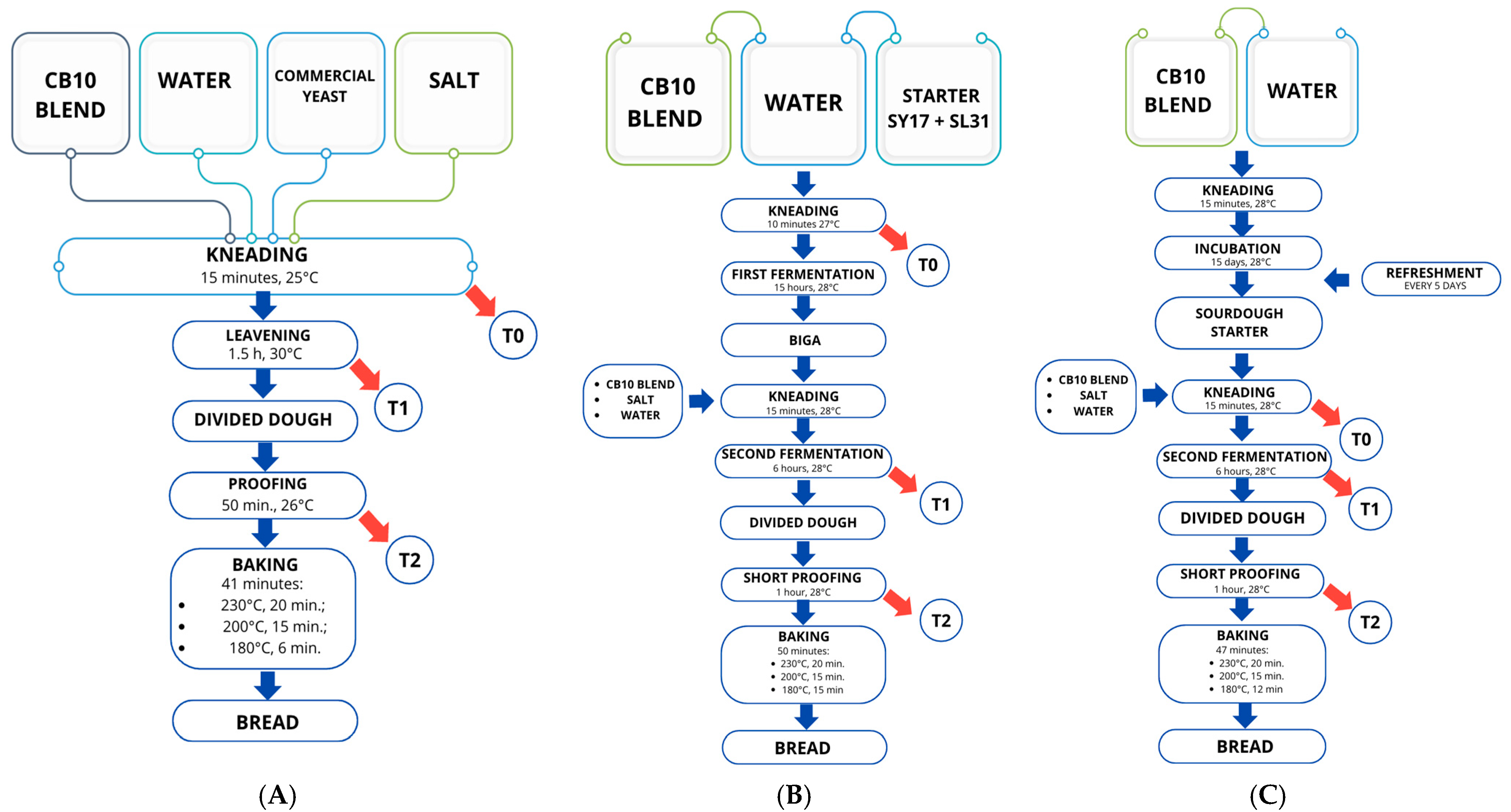 - LI: CB10 blend (400 g) was mixed with water, adjusted according to farinograph absorption values, in which the selected strains SY17 and SL31 were suspended at approximate concentrations of ~4.5 and ~5.5 log CFU/mL, respectively. The dough was kneaded for 10 min in a planetary mixer and then subjected to a first fermentation in a fermentation chamber (15 h, 28 °C), thus obtaining a biga, a traditional Italian stiff pre-ferment. Afterwards, the flour blend (1600 g), water (adjusted to the absorption capacity determined by farinograph analysis), and salt (30 g) were added to the biga and mixed for 15 min in a planetary mixer. A second fermentation was then carried out in a fermentation chamber at 28 °C for 6 h. Each loaf (approximately 300 g) was shaped into aluminum trays and subjected to a final proofing step (1 h). Baking was performed in a static electric oven for a total of 50 min, under the following temperature profile: 230 °C for the first 20 min, 200 °C for 15 min, and 180 °C for the remaining 15 min.