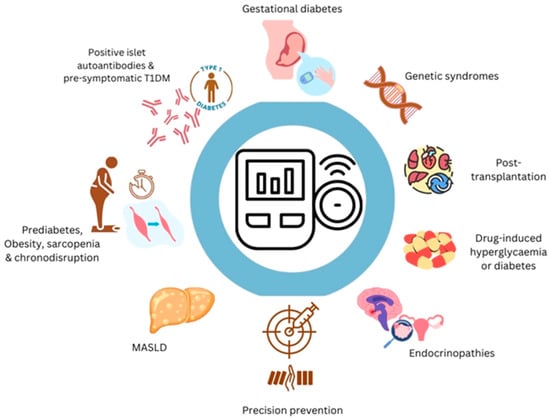 The aim of this narrative review is to evaluate the current evidence around the use of CGM in people at high risk of diabetes, based on randomised controlled trials (RCTs), observational studies, systematic reviews, and meta-analyses. In contrast to previous reviews that focused on individual subgroups or wellness applications, this review integrates evidence across multiple high-risk populations and explores the potential of CGM in precision prevention and real-time biofeedback with or without bioinformatics-driven risk stratification. We used the keywords ‘type 1 diabetes’, ‘type 2 diabetes’, and terms related to high risk of diabetes alone and in combination to retrieve the available literature data from PubMed from inception until April 2025. High-risk groups included people with pre-symptomatic type 1 diabetes with positive islet autoantibodies, pre-type 2 diabetes or other metabolic dysfunction associated with changes in body composition, metabolic dysfunction-associated steatotic liver disease (MASLD), and gestational diabetes mellitus (GDM), as well as other endocrinopathies associated with glucose intolerance, including polycystic ovarian syndrome (PCOS) and acromegaly. They may also include individuals with solid organ transplantation, those treated with specific medications such as steroids and immune checkpoint inhibitors, and people with specific genetic syndromes affecting glucose and/or insulin metabolism. Herein, dysglycaemia is used as a general term for elevated blood glucose, including impaired fasting glucose, impaired glucose tolerance, prediabetes, or type 2 diabetes. Prediabetes refers to impaired fasting glucose and/or impaired glucose tolerance as per American Diabetes Association/World Health Organisation criteria [7]. Early T2DM refers to a diagnosis of type 2 diabetes within the last 5 years or newly diagnosed at screening. Given the heterogeneity of populations and study designs, a systematic review or meta-analysis was not feasible. Hence, we adopted a narrative approach to synthesise the available evidence. Table 1 summarises the potential future applications and limitations of CGM across high-risk groups for dysglycaemia and diabetes.