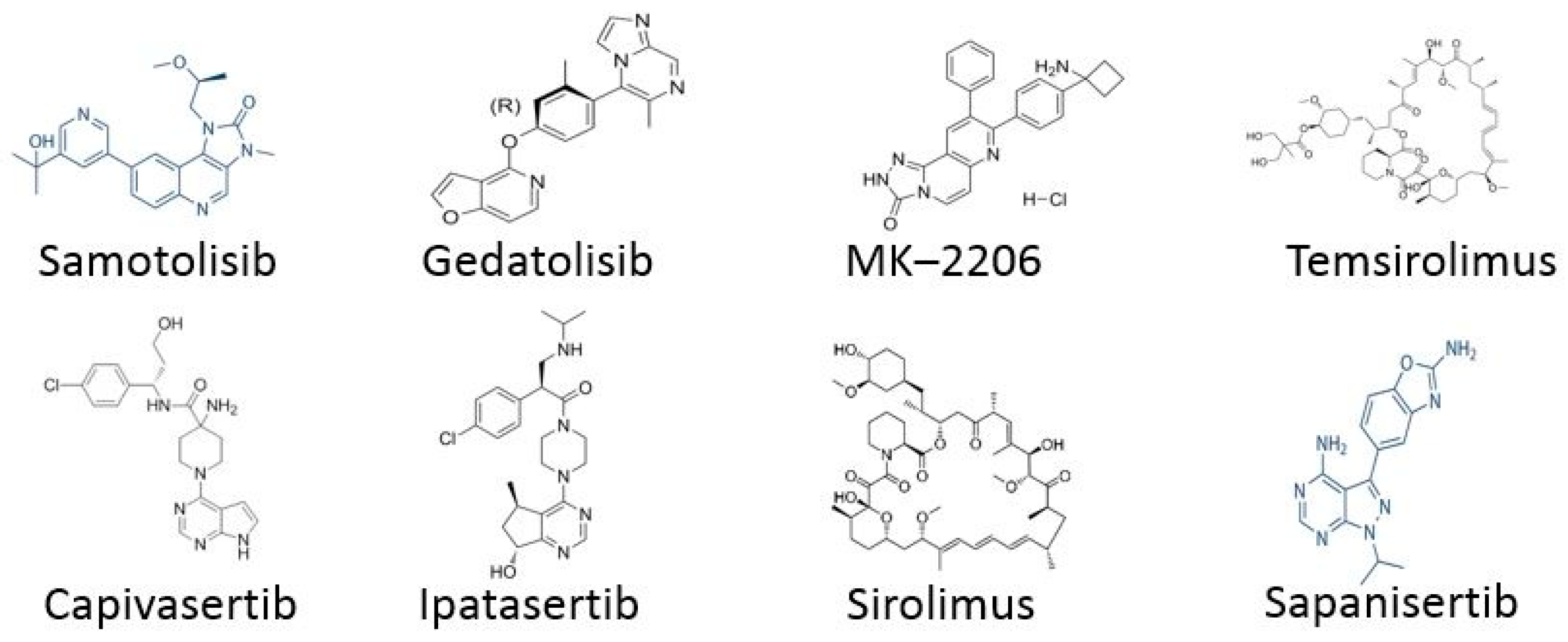 - Owonikoko, T.K.; Khuri, F.R. Targeting the PI3K/AKT/mTOR pathway: Biomarkers of success and tribulation. Am. Soc. Clin. Oncol. Educ. Book 2013, 33, e395–e401. [Google Scholar] [CrossRef] [PubMed] [PubMed Central]