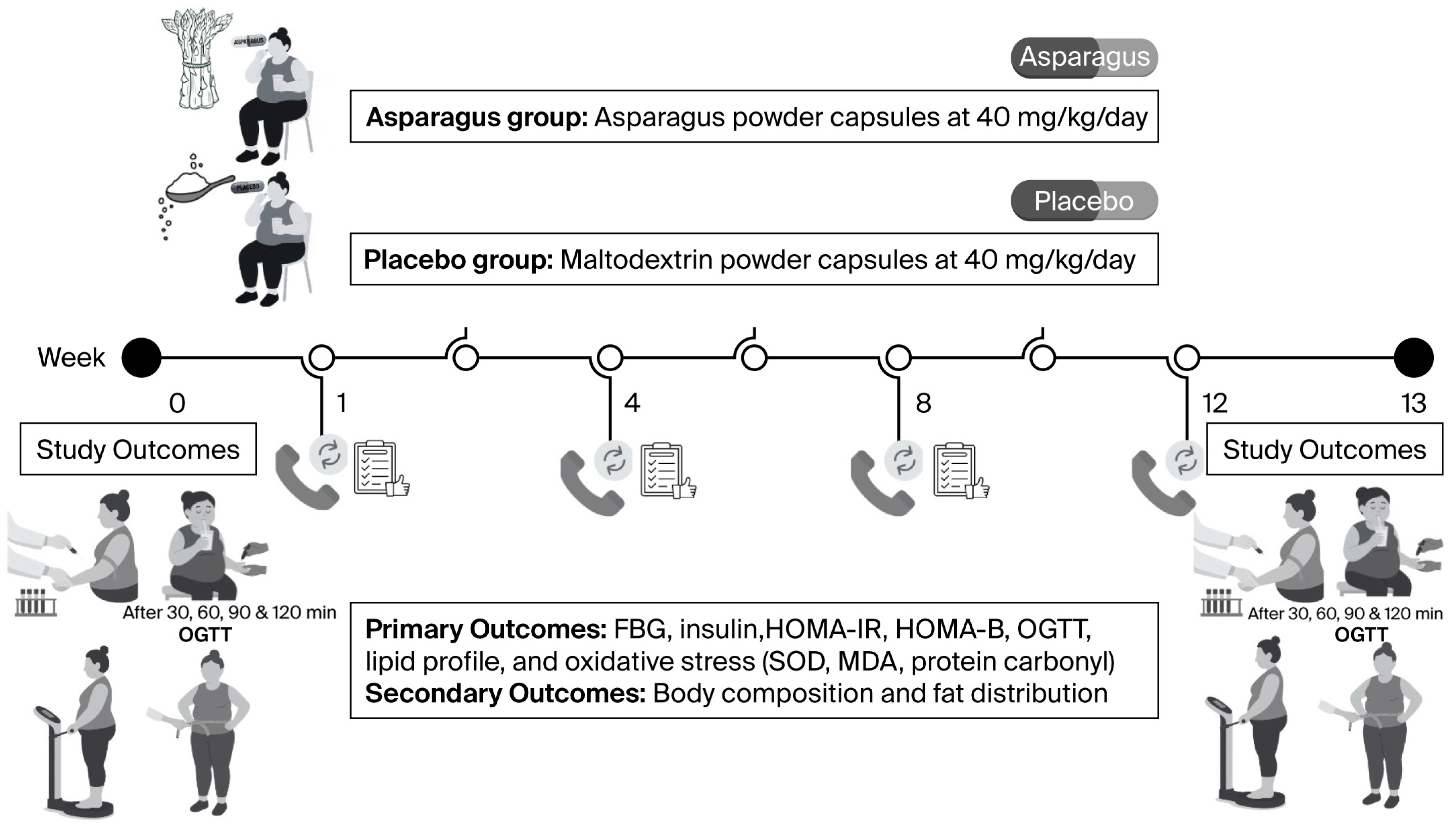 Mongraykang, J.; Padkao, T.; Boonla, O.; Teethaisong, Y.; Roengrit, T.; Koowattanatianchai, S.; Prasertsri, P. Effects of Asparagus Powder Supplementation on Glycemic Control, Lipid Profile, and Oxidative Stress in Overweight and Obese Adults: An Exploratory Randomized Controlled Trial. Life 2025, 15, 1584. https://doi.org/10.3390/life15101584
