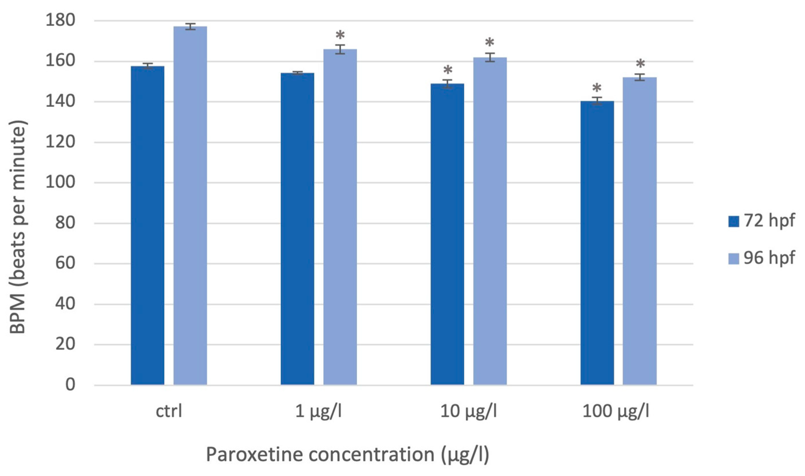 They are sufficiently lipophilic to be easily transported in the central nervous system, and they are also relatively resistant to degradation [64]. It has been observed that the main consequence in the absorption of these chemicals is inhibition of hatching, with consequent side effects on the embryo, such as a wavy notochord, body axis malformation, and somite defects [65]. Evidence in the literature showed that the duration of exposure and pharmacological metabolites are important factors that alter larvae behavior [46]; for example, antidepressants are among the drugs capable of significantly altering the swimming activity of larvae [46,66]. In our experimentation, an evident secondary consequence on embryonic development was the alteration of the normal physiology of the heartbeat, which we have already recorded at low concentrations, such as that of 1 µg/L selected for our experimentation. Similarly, Zhu and collaborators [67] have shown that exposure to paroxetine at concentrations higher than our experimentations, namely 5.0, 10, and 20 mg/L, caused a decrease in heart rate and blood flow; moreover, they highlighted a decrease in larvae body length. Residues of this drug in the natural environment (mainly in surface waters) can become major sources of pollution in the aquatic environment, with consequences for living organisms [68].
