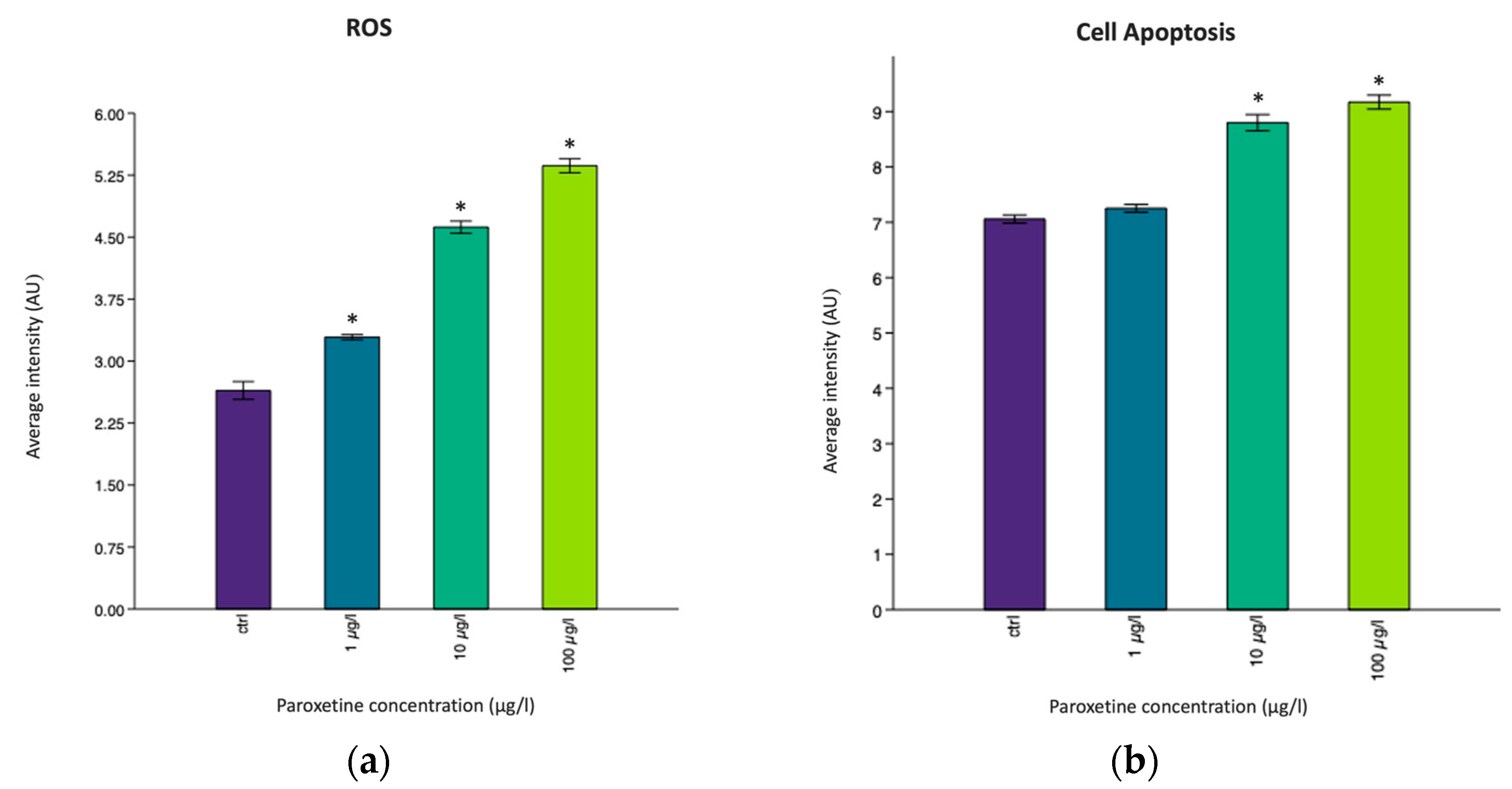 Studies report that antidepressants are able to decrease the ability to respond to stress, because they alter the hypothalamic–pituitary–adrenal (HPA) axis [72,73]; it is evident that fluoxetine and venlafaxine modify lipid peroxidation, alter the levels of protein carbonyl, and also affect antioxidant enzymes [74]. This imbalance promotes oxidation, which causes structural changes in biomolecules, such as carbohydrates, lipids, proteins, and nucleic acids, thus causing cellular alterations that can lead to high levels of inflammation and even cell death [75,76,77]. Particularly, increased oxidative stress was observed following SSRI treatment in animals that had not been subjected to stress or other types of oxidative insult. Increased lipid peroxidation and decreased antioxidant defense were noted in brain tissues of non-stressed rats following acute and chronic sertraline treatment (10 mg/kg/day, 40 mg/kg/day, 80 mg/kg/day) [78]. Pro-oxidant effects in non-stressed rats have also been reported for chronic fluoxetine treatment in hepatic tissue. In vitro studies have highlighted that SSRIs are able to increase neurological side-effects and cytotoxicity. Sertraline and paroxetine are able to induce astrocyte apoptosis, because they cause an increase in [Ca2+] [79,80], dysfunction of mitochondria, and activation of caspase, which lead to ROS generation [81]. Also, our in vivo results confirmed the ability of paroxetine to induce ROS generation in exposed groups. Consequently, ROS production can cause apoptosis, as reported in the astrocyte cell line [81]. The same occurred in our investigation, especially for the exposed groups of 10 µg/L and 100 µg/L, where significant fluorescence of apoptotic cells was detected. Thus, paroxetine was also able to induce cellular apoptosis, as has been demonstrated by other pollutants in several species of fish [82,83].