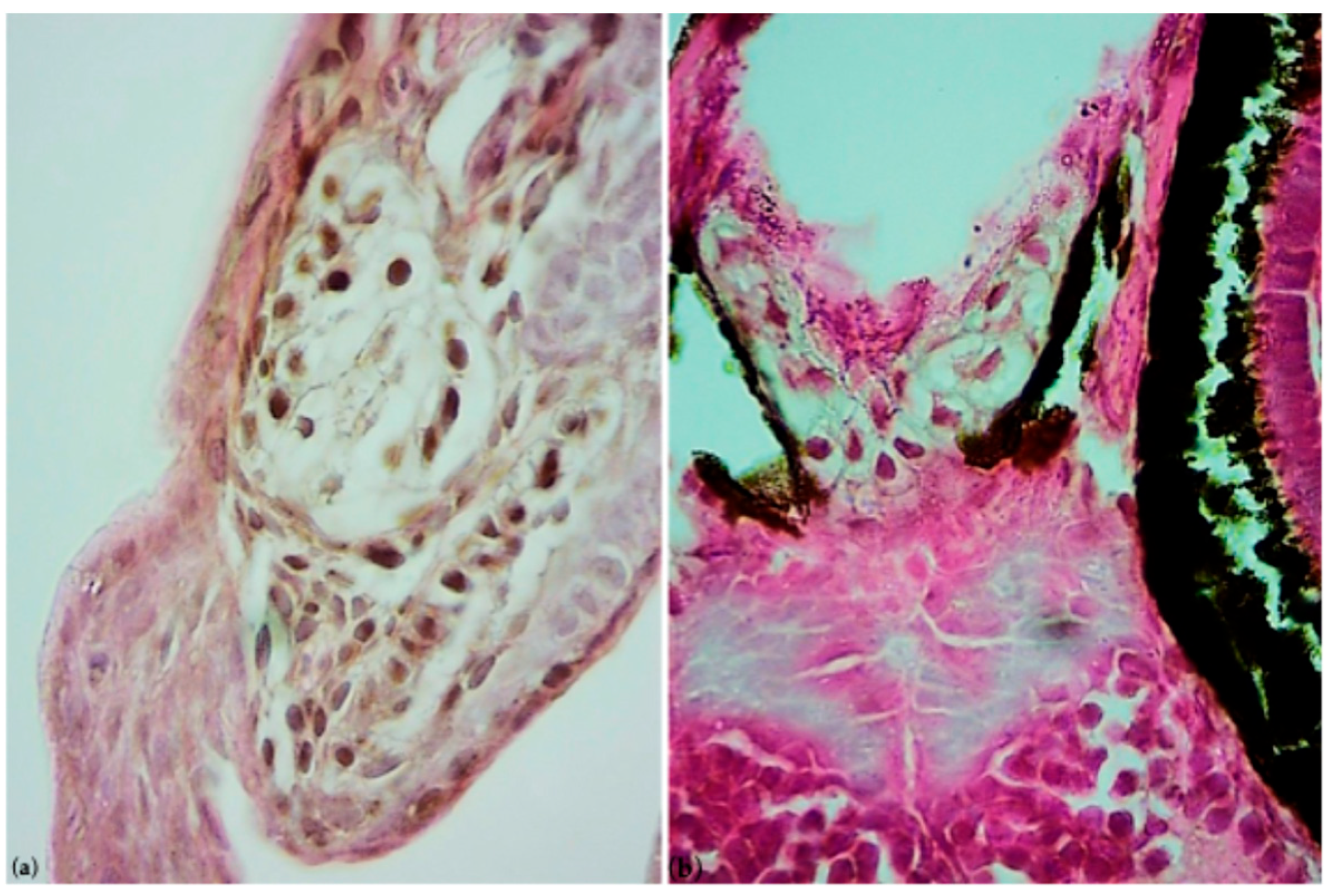 Figure 5. Detail of cellular infiltrations on the head of the larvae exposed to (a) 10 µg/L paroxetine and (b) 100 µg/L paroxetine. Cells appear with cytoplasmic vacuoles and eccentric nucleus, observed at 1000× magnification.