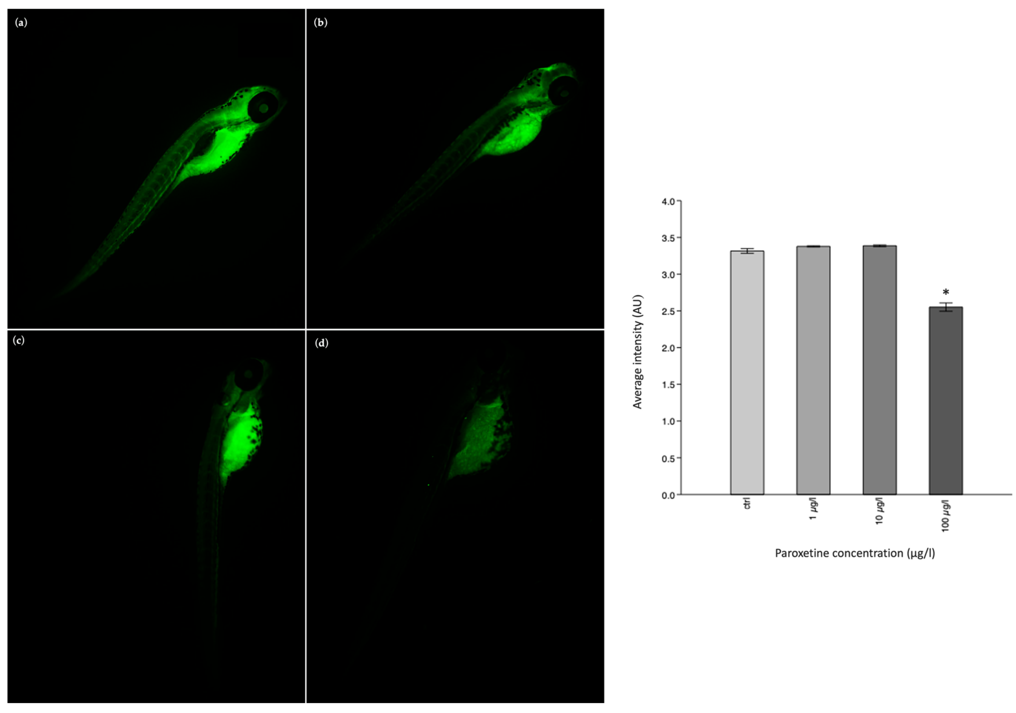 Figure 6. AChE antibody-staining. (a) Larva control, (b) larva exposed to 1 µg/L paroxetine, (c) larva exposed to 10 µg/L paroxetine, and (d) larva exposed to 100 µg/L paroxetine. The histogram represents the average fluorescence intensity (AU) of AChE biomarker; * p < 0.05.