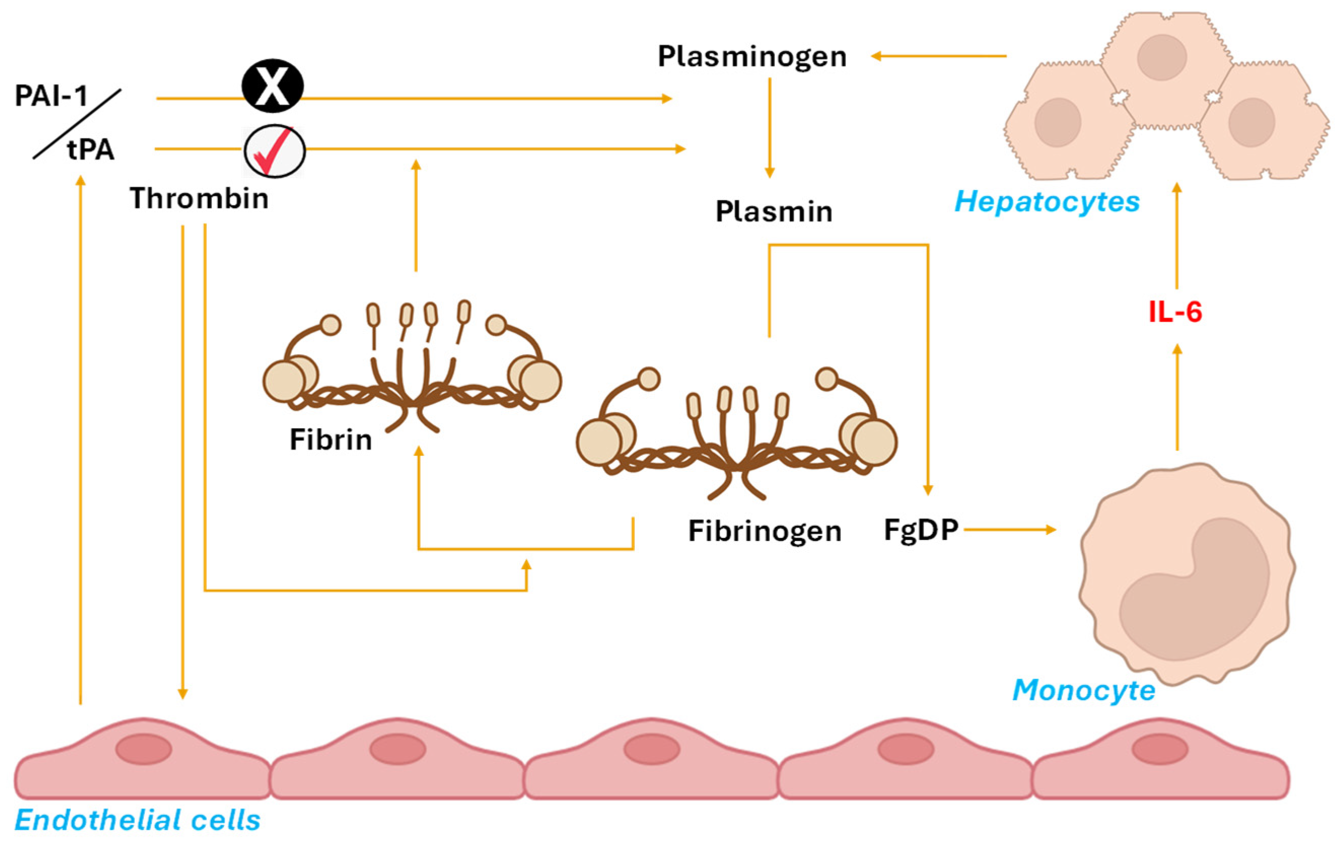 FgDP–IL-6–plasminogen axis | Tune fibrinolysis recovery without excessive IL-6 surge. Balanced: maintain fibrinolysis while preventing IL-6 overshoot; stable plasminogen pool | -tPA/tenecteplase (↑plasmin, ↑FgDP use for lysis, but may ↑IL-6); -PAI-1↑ (physiologic/inflammatory) dampens fibrinolysis; -fibrates (↓PAI-1). | -PAI-1 inhibitors (pro-fibrinolytic; may ↑FgDP → watch IL-6); -IL-6 blockade to cap cytokine surge during high FgDP states; -hepatocyte-targeted FgDP-mimic without leukocyte activation | -β2-integrin/TLR activation on monocytes must be avoided |