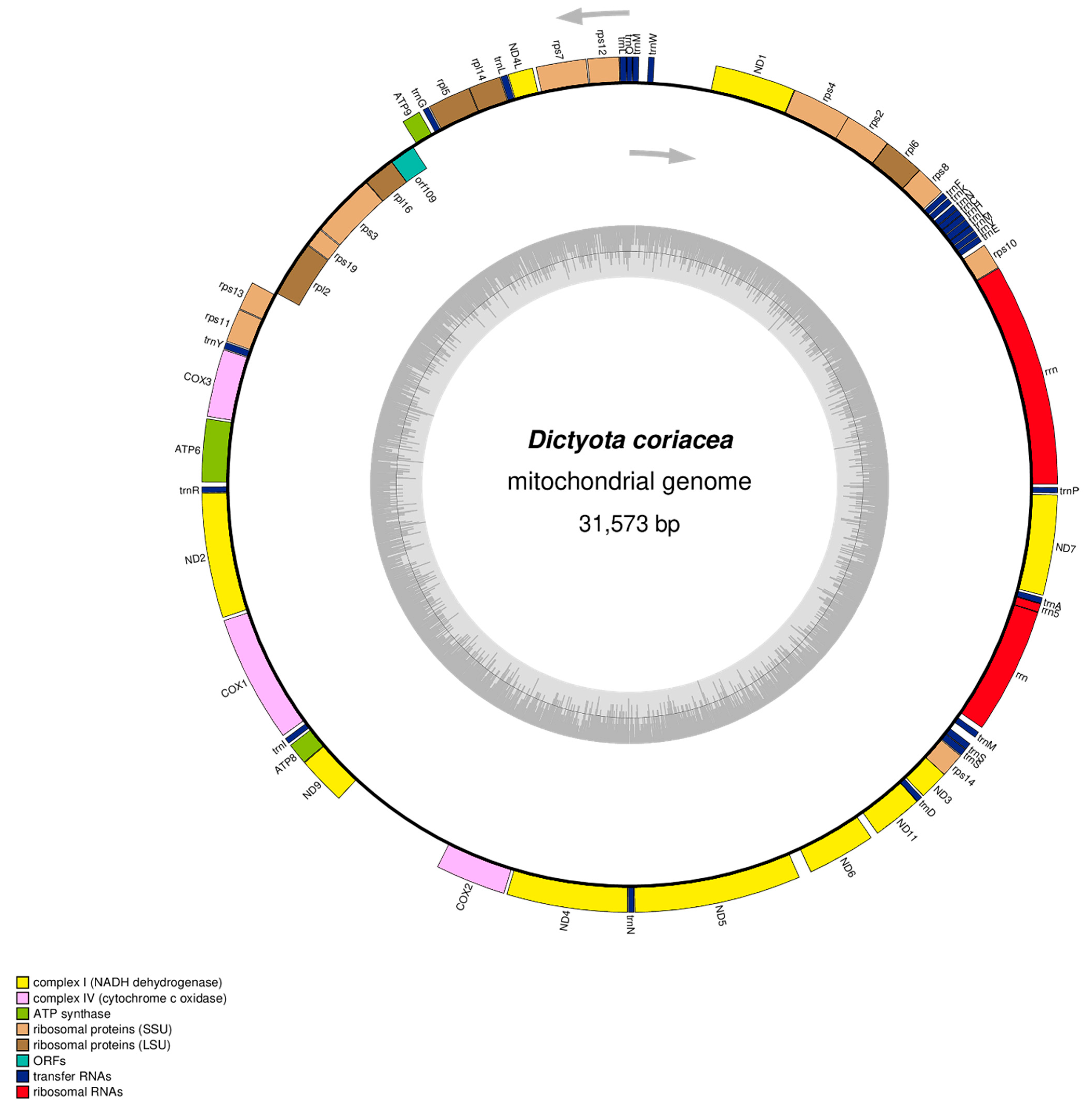 Patil, M.P.; Woo, H.-E.; Jeon, Y.J.; Kitamura, S.-I.; Kim, Y.-R.; Kim, J.-O.; Kim, K. The First Complete Mitogenome Characterization of Brown Alga Dictyota coriacea (Phaeophyceae, Heterokontophyta) and Its Phylogenetic Analysis. Life 2025, 15, 1605. https://doi.org/10.3390/life15101605