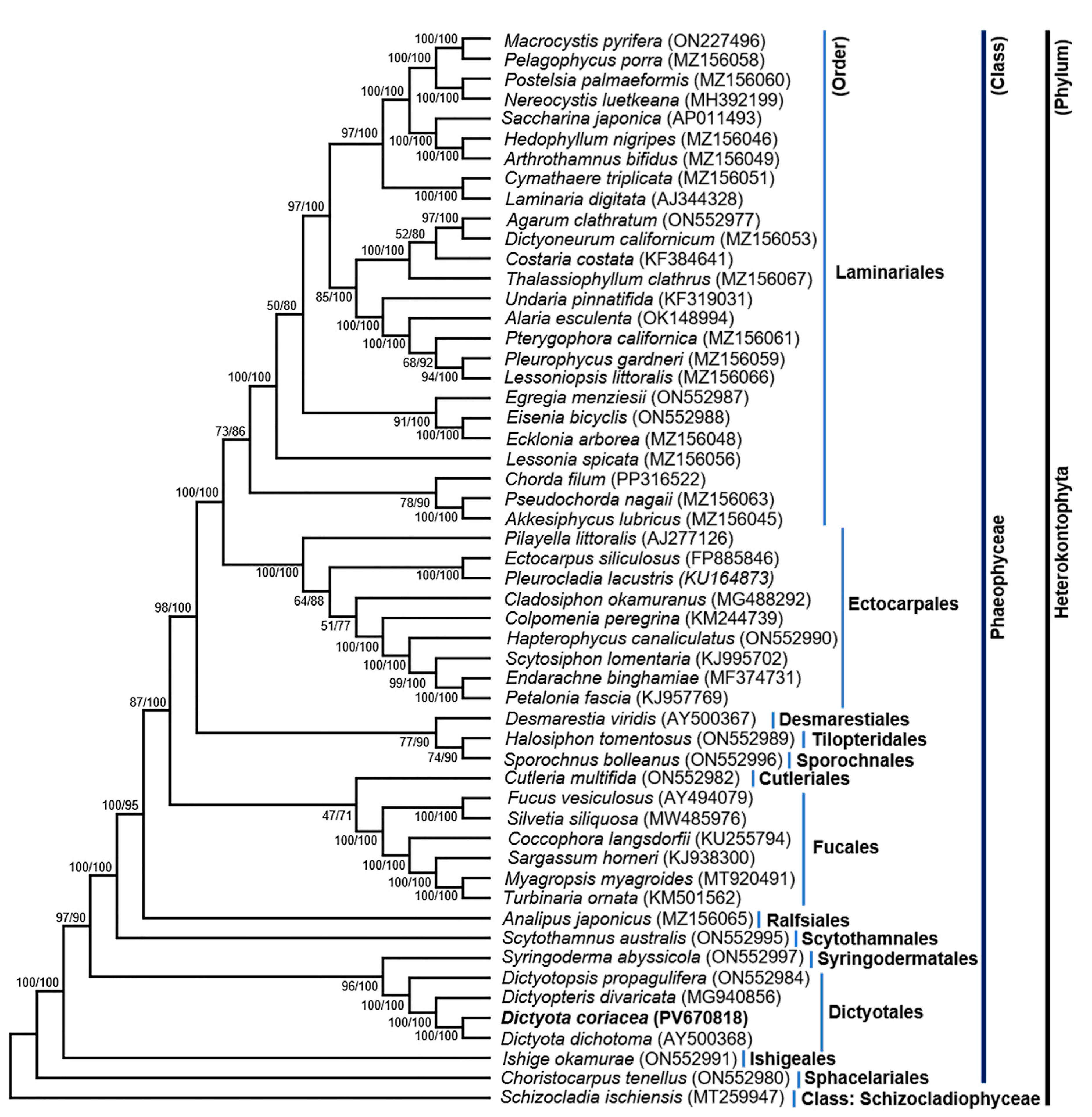 Patil MP, Woo H-E, Jeon YJ, Kitamura S-I, Kim Y-R, Kim J-O, Kim K. The First Complete Mitogenome Characterization of Brown Alga Dictyota coriacea (Phaeophyceae, Heterokontophyta) and Its Phylogenetic Analysis. Life. 2025; 15(10):1605. https://doi.org/10.3390/life15101605
