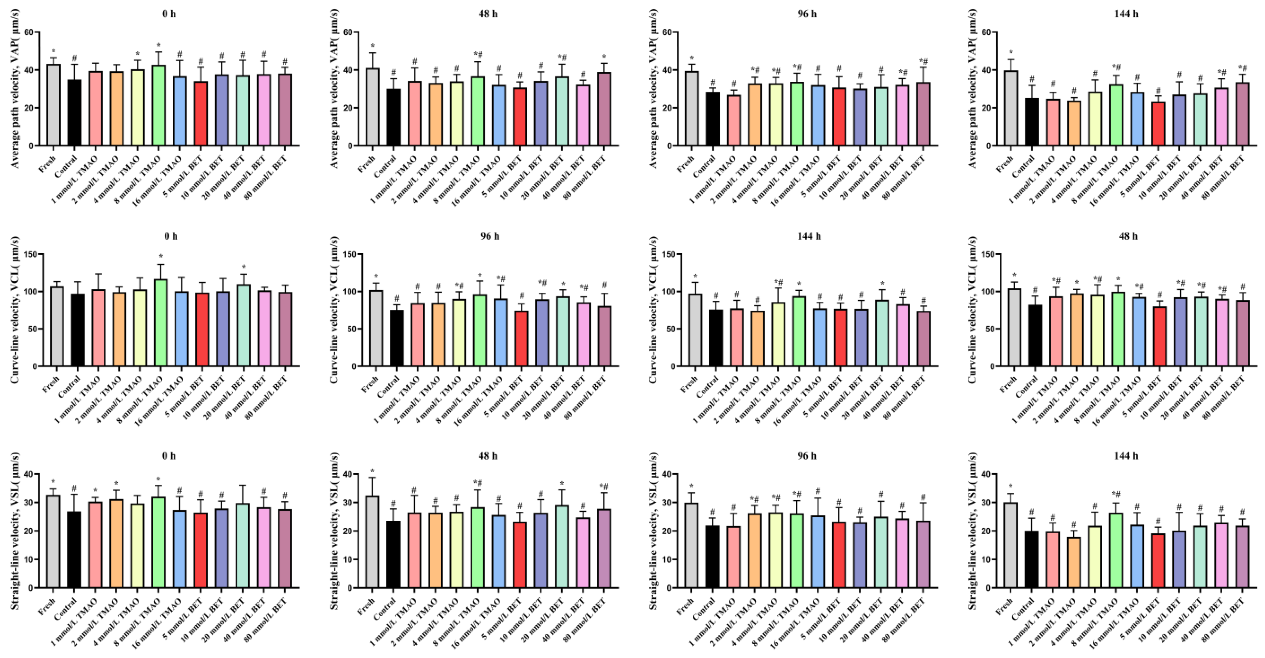 At 144 h, among the different TMAO concentrations, the 8 mmol/L TMAO group showed the most marked improvement in kinetic parameters compared with the pressurized control group (p < 0.05); among the different BET concentrations, the 20 mmol/L BET group showed the greatest improvement, with TM and VCL significantly increased (p < 0.05).