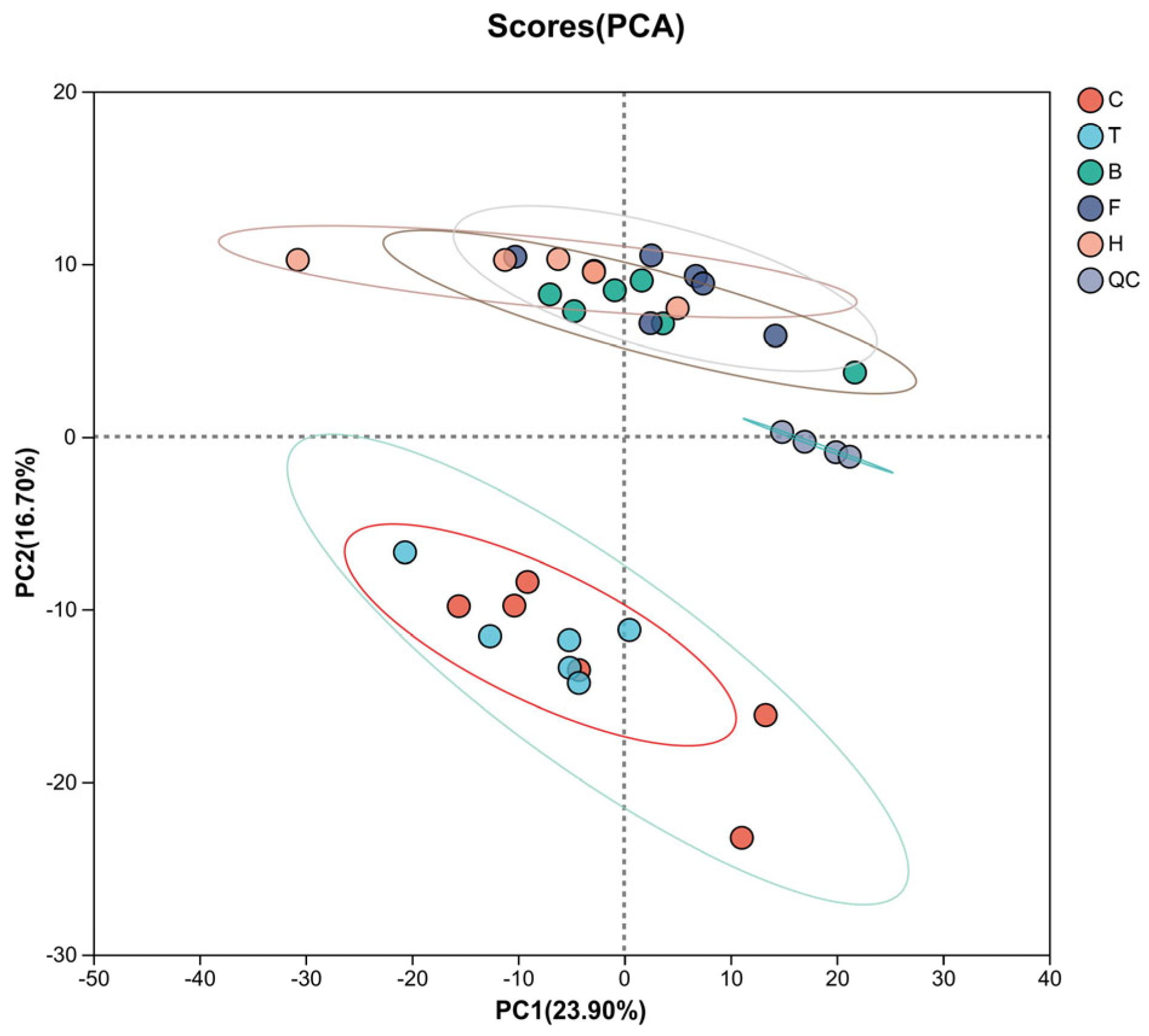 Figure 2. PCA score plot of boar sperm stored at room temperature under HP stress. C: pressurized control group; T: 105 kPa + TMAO group; B: 105 kPa + BET group; F: fresh sperm group; H: 105 kPa + TMAO + BET group; QC: quality control.