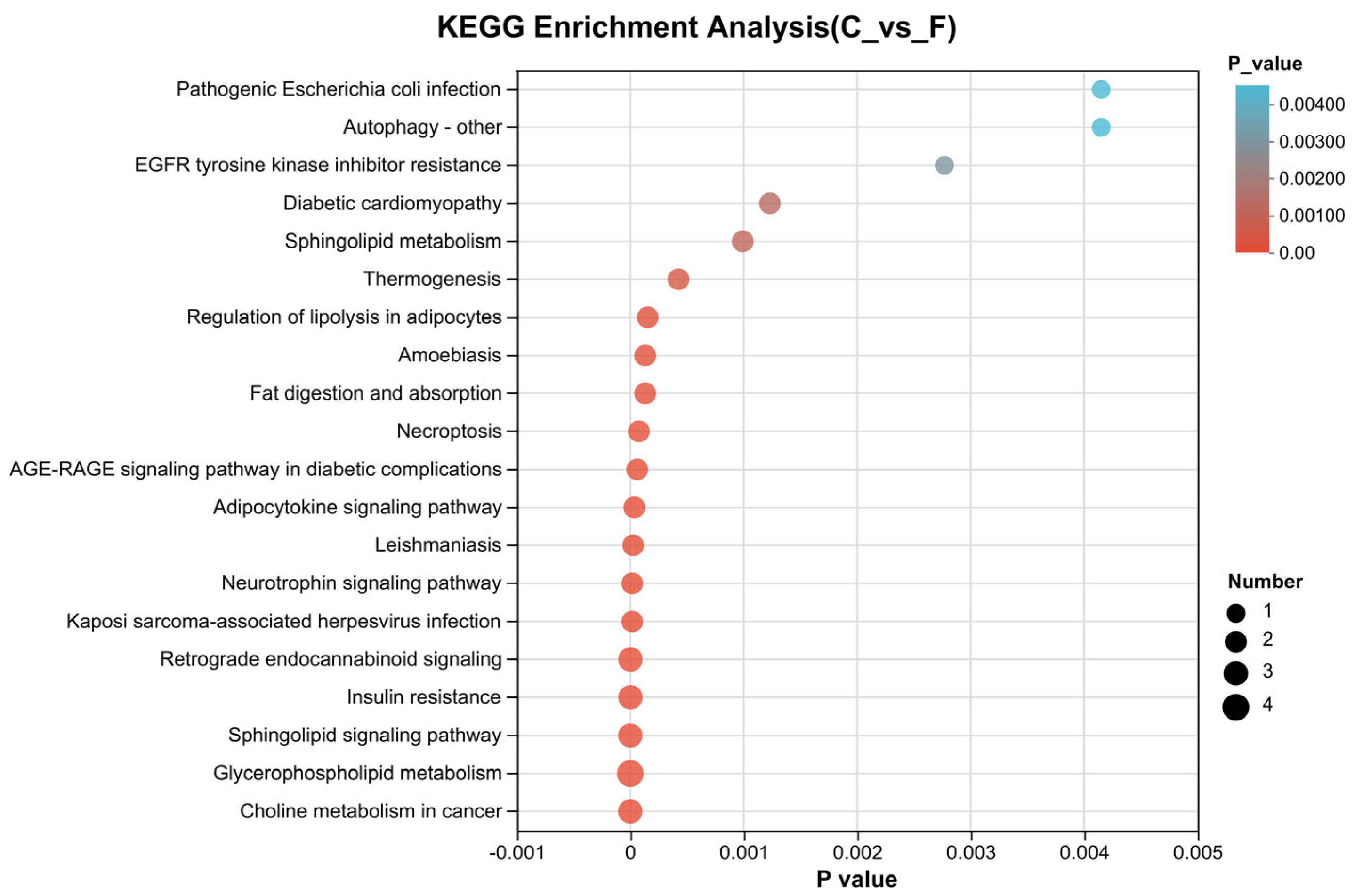 Figure 5. KEGG pathway enrichment analysis bubble plot of boar sperm stored at room temperature under HP stress. F: fresh sperm group; C: pressurized control group.