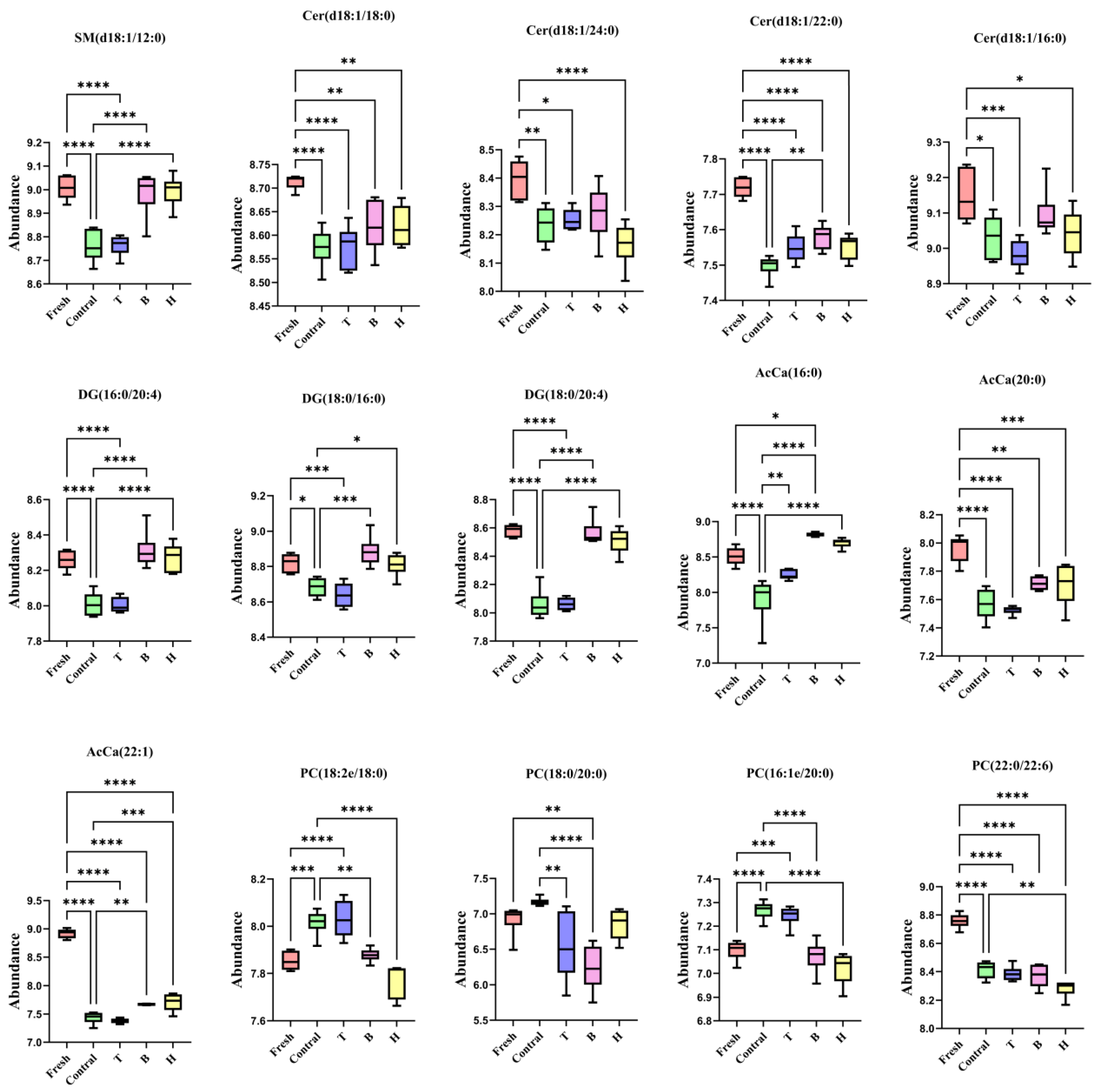Figure 6. Expression levels of differential lipids in boar sperm stored at room temperature under HP stress. * indicates p < 0.05, ** indicates p < 0.01, *** indicates p < 0.001, and **** indicates p < 0.0001.