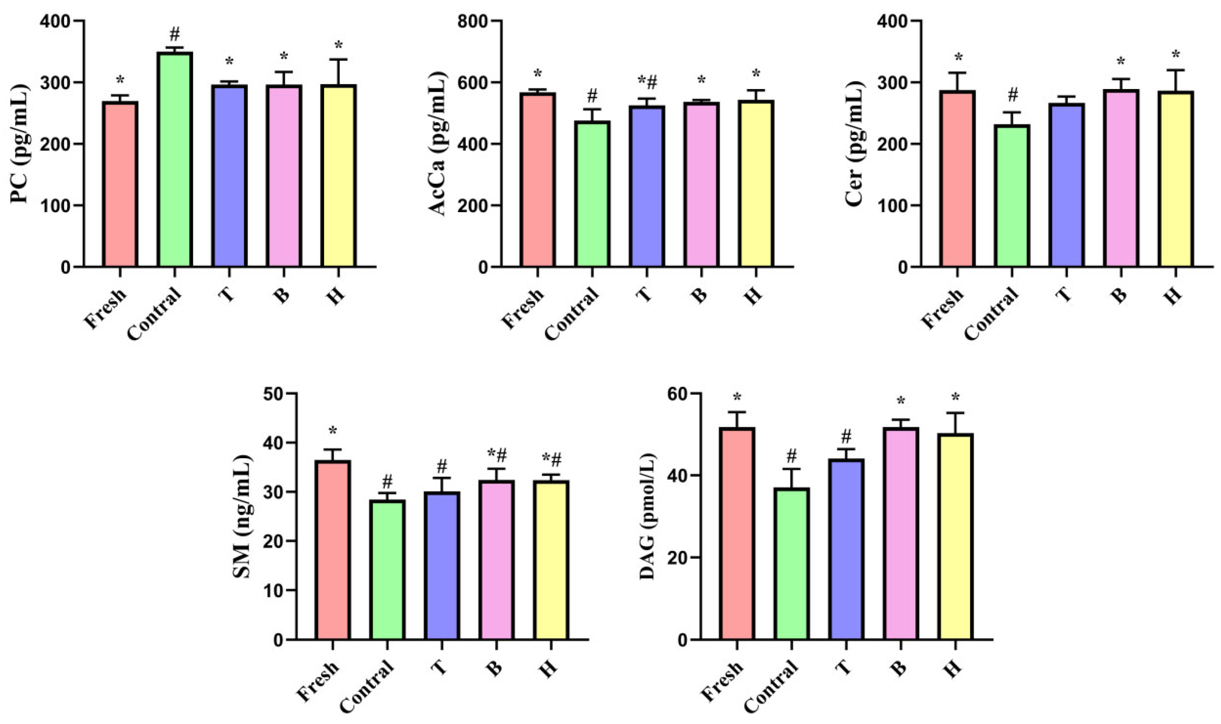 Figure 7. Effects of TMAO or BET on the contents of DG, PC, SM, Cer, and AcCa in boar sperm under HP stress during liquid storage. Data are presented as mean ± SD (n = 3). Symbols indicate statistical significance: # compared with the fresh control group, * compared with the HP control group, p < 0.05; no symbol indicates p > 0.05.