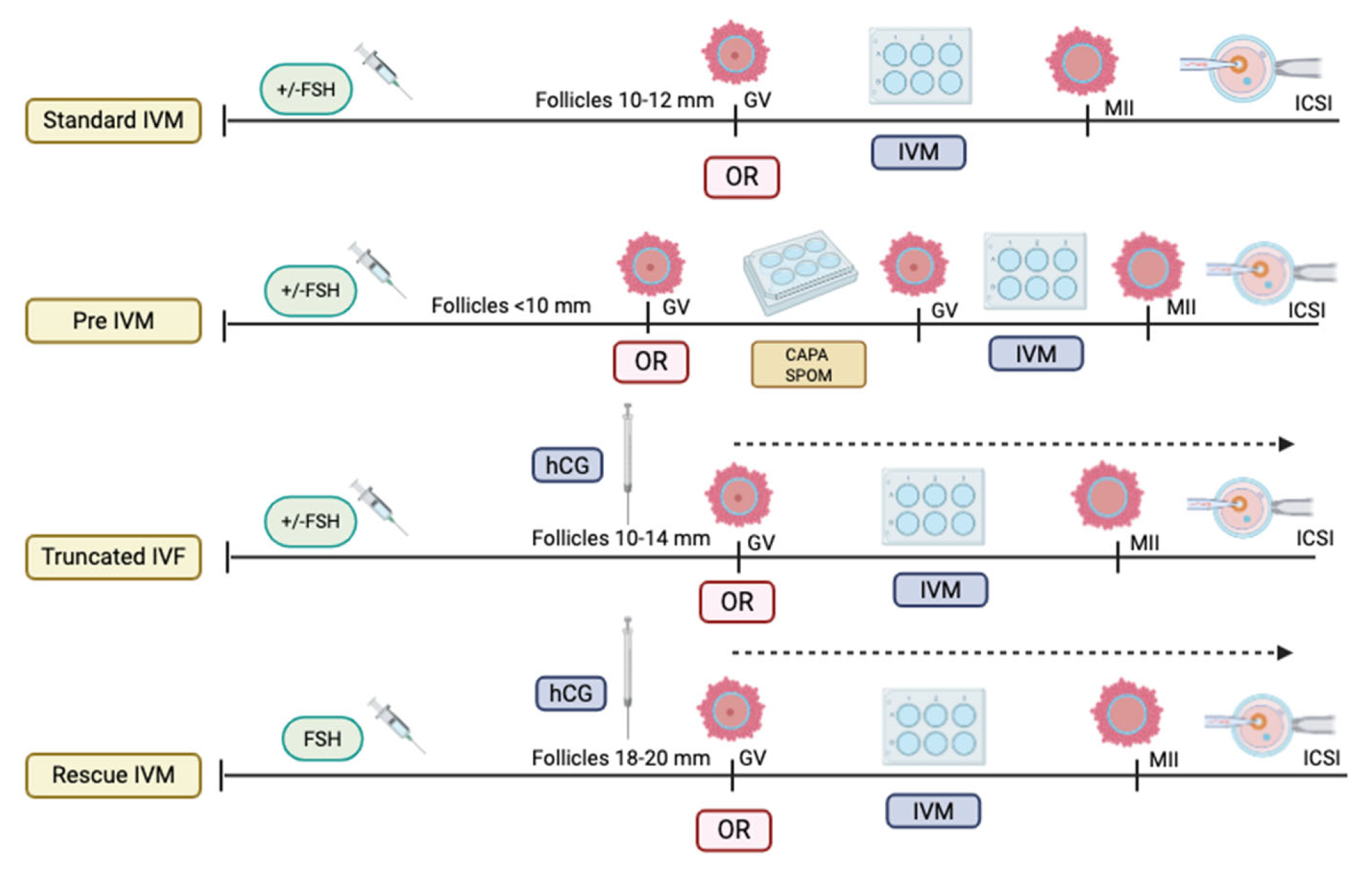 - Vuong, L.N.; Pham, T.D.; Ho, T.M.; De Vos, M. Outcomes of clinical in vitro maturation programs for treating infertility in hyper responders: A systematic review. Fertil. Steril. 2023, 119, 540–549. [Google Scholar] [CrossRef] [PubMed]