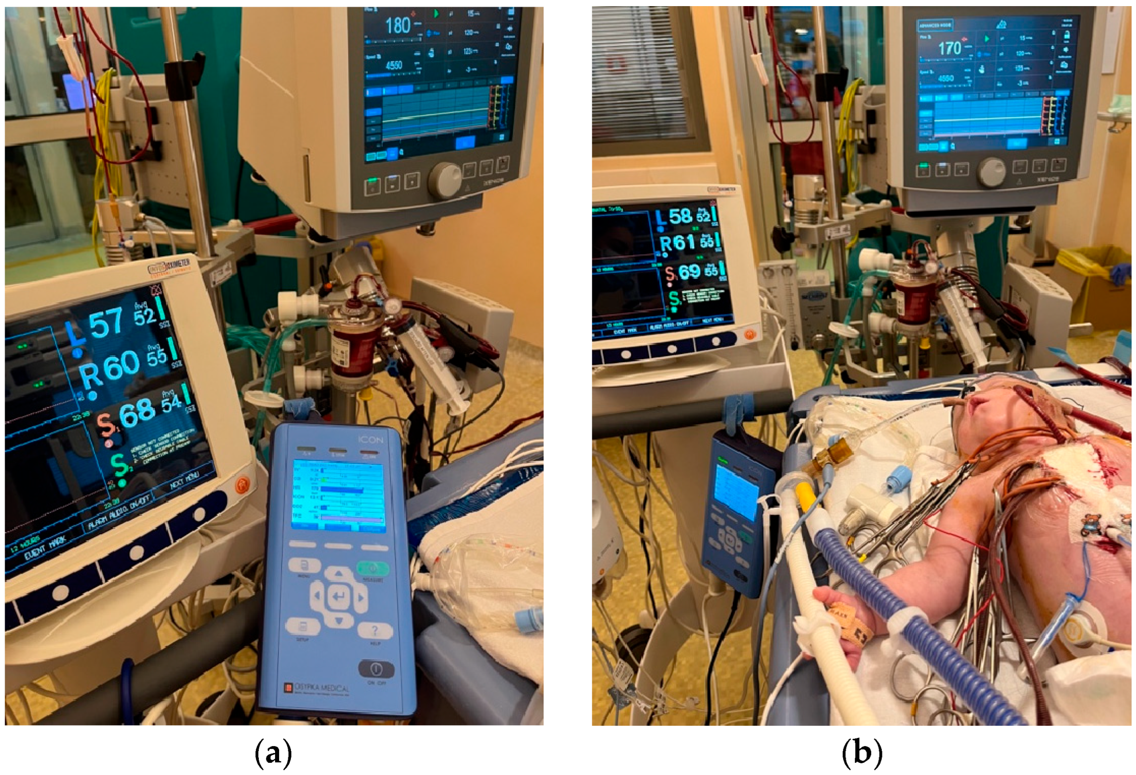 - Li, F.; Dong, W. Research Progress of Noninvasive Cardiac Output Monitor (NICOTM) and Hemodynamic Monitor in Neonates. Clin. Exp. Obstet. Gynecol. 2023, 50, 211. [Google Scholar] [CrossRef]