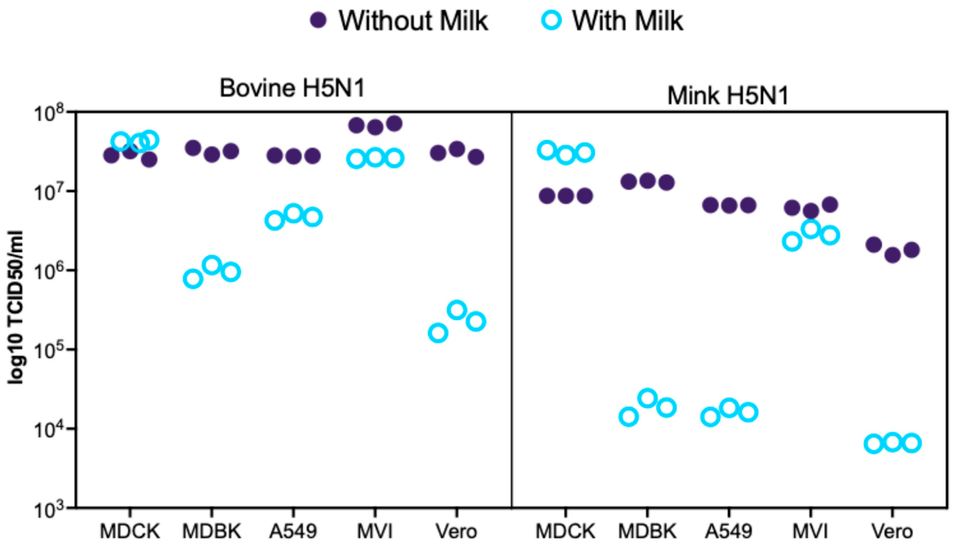 Differential Host Responses and Viral Replication of Highly Pathogenic Avian Influenza H5N1 Strains in Diverse Cell Lines with a Raw Milk Supplement