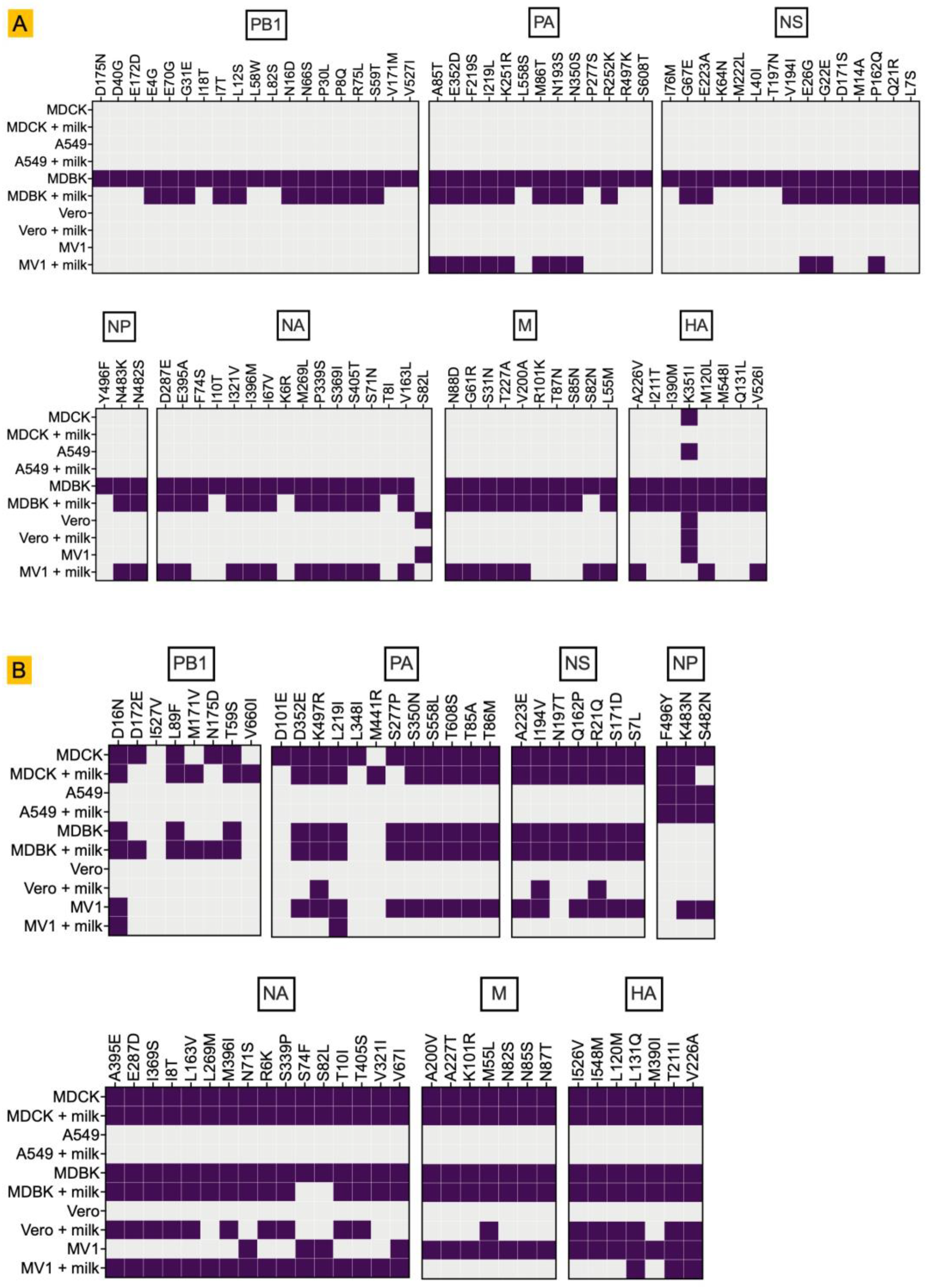 - Alignment: Samples from bovine-H5N1 infected cells were aligned against the full genome sequence of A/dairy cattle/Kansas/5/2024 (NCBI GenBank ID PP732373-80). Samples from mink H5N1-infected cells were aligned against the full genome sequence of A/Mink/Spain/3691-8_22VIR10586-10/2022 (GISAID ID EPI2220590-97) (Table 1).