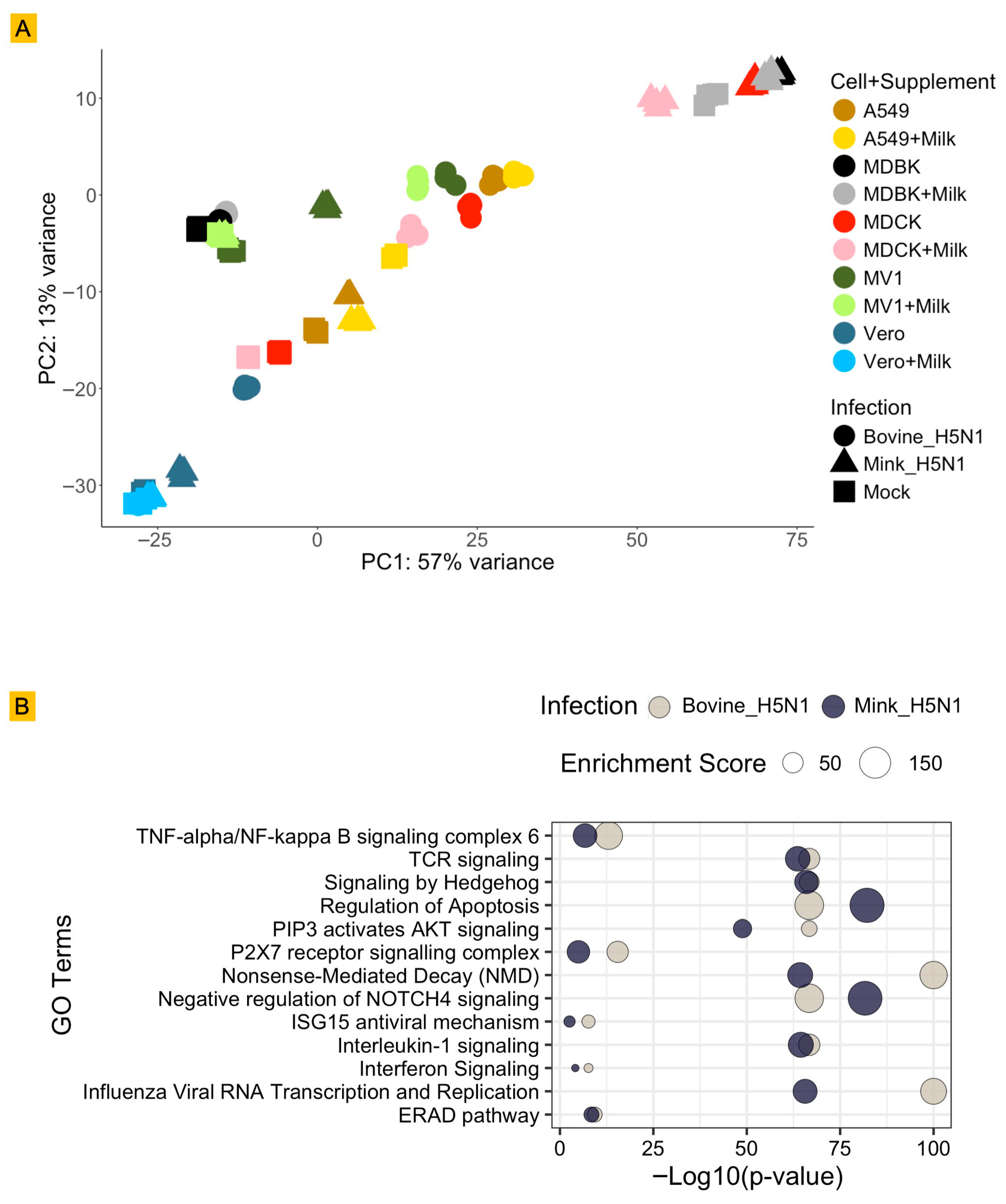 - Singh, G.; Kafle, S.; Assato, P.; Goraya, M.; Morozov, I.; Richt, J.A. Single-Cell Analysis of Host Responses in Bovine Milk Somatic Cells (bMSCs) Following HPAIV Bovine H5N1 Influenza Exposure. Viruses 2025, 17, 811. [Google Scholar] [CrossRef]