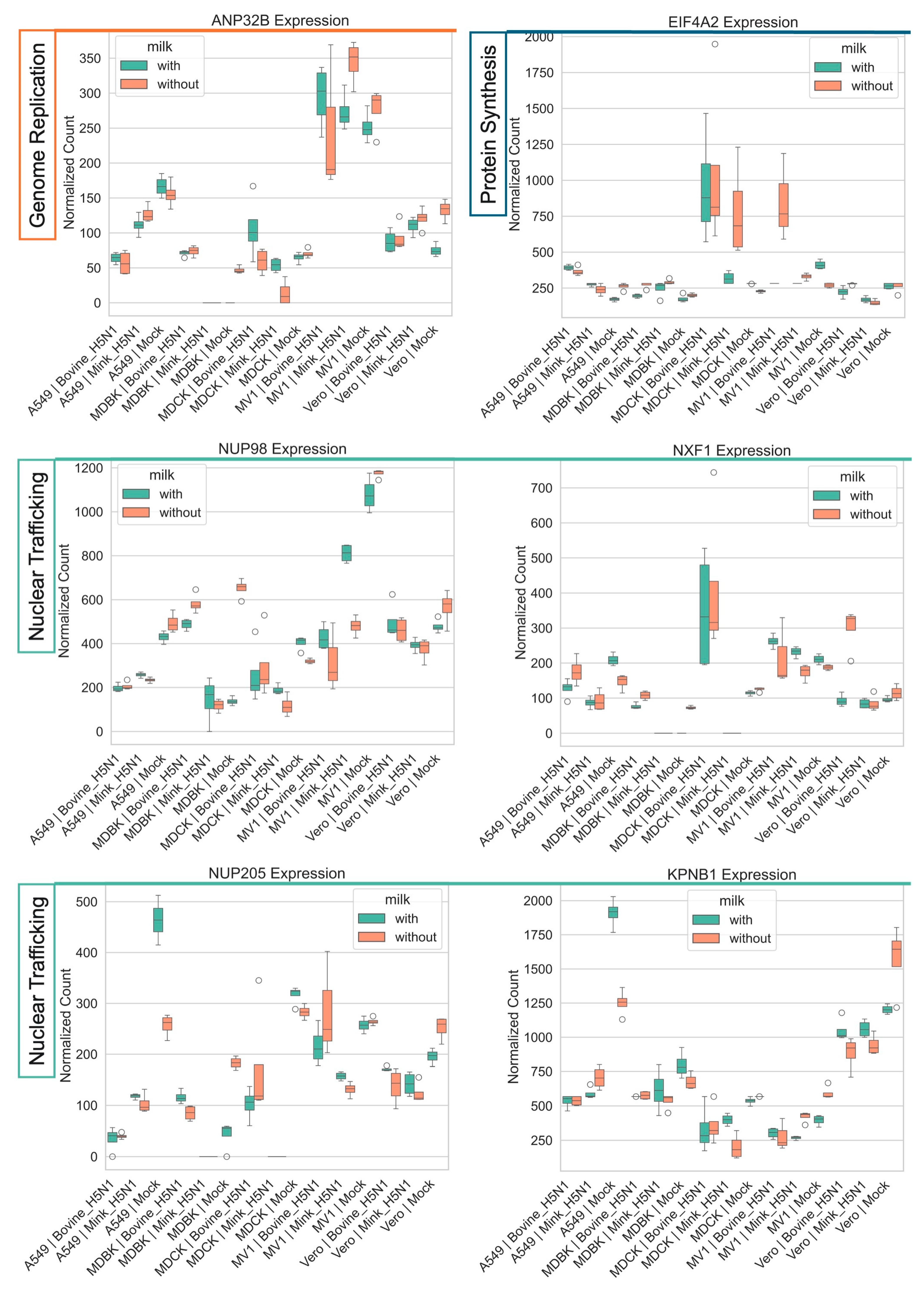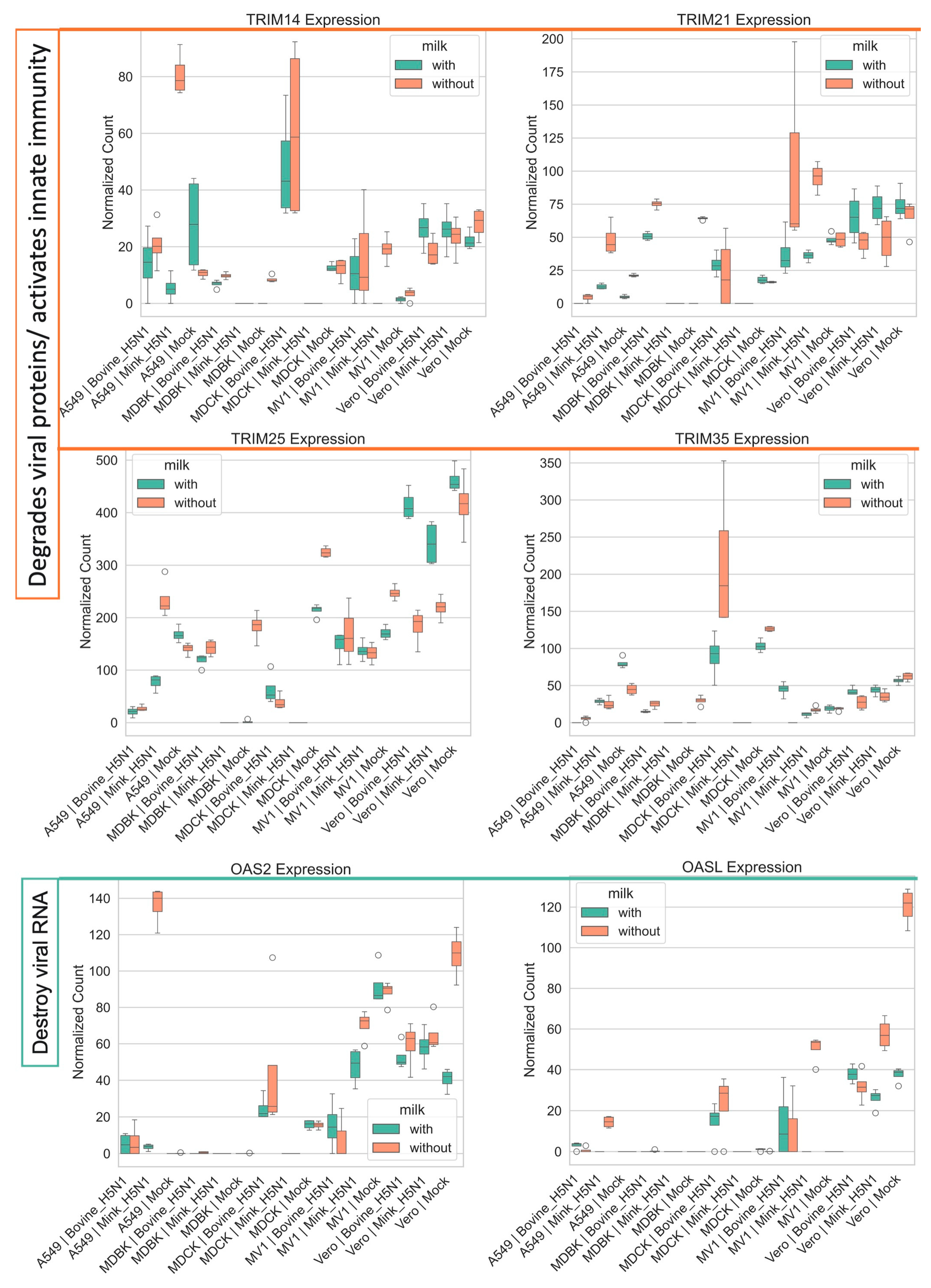 3.4. Modulation of Specific Host Gene Expression by H5N1 Infection and Raw Milk