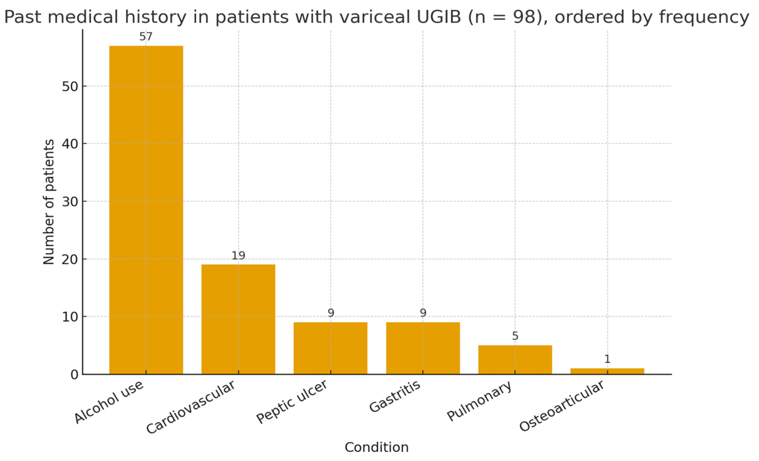 In this retrospective cohort of 98 patients admitted for variceal upper gastrointestinal bleeding between 2009 and 2014, we observed outcomes that are consistent with the historical burden of this condition. Despite advances in diagnosis and endoscopic therapy, VUGIB continues to carry substantial short-term mortality, in line with the reported 6-week mortality of 15–20% in international cohorts [