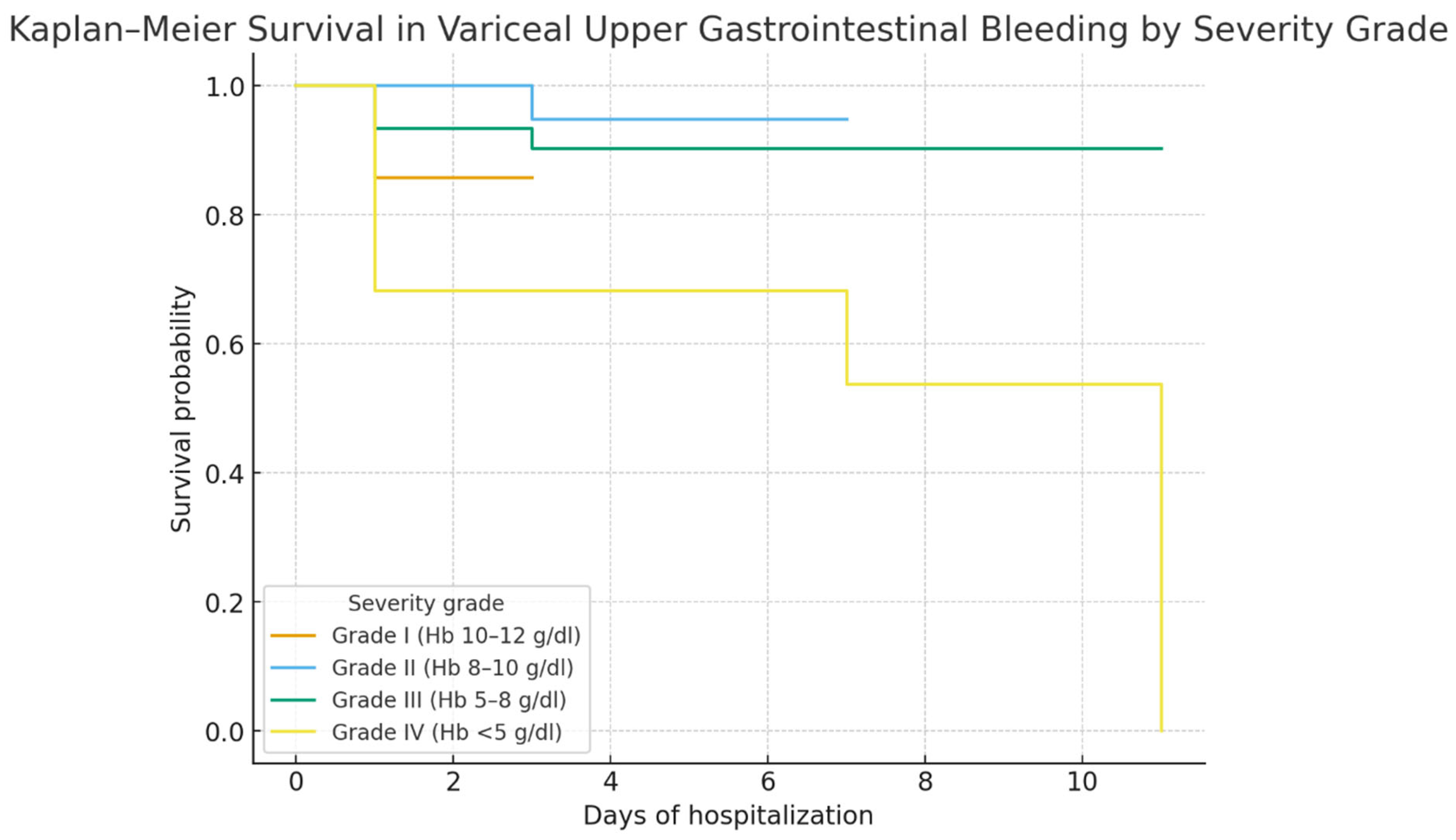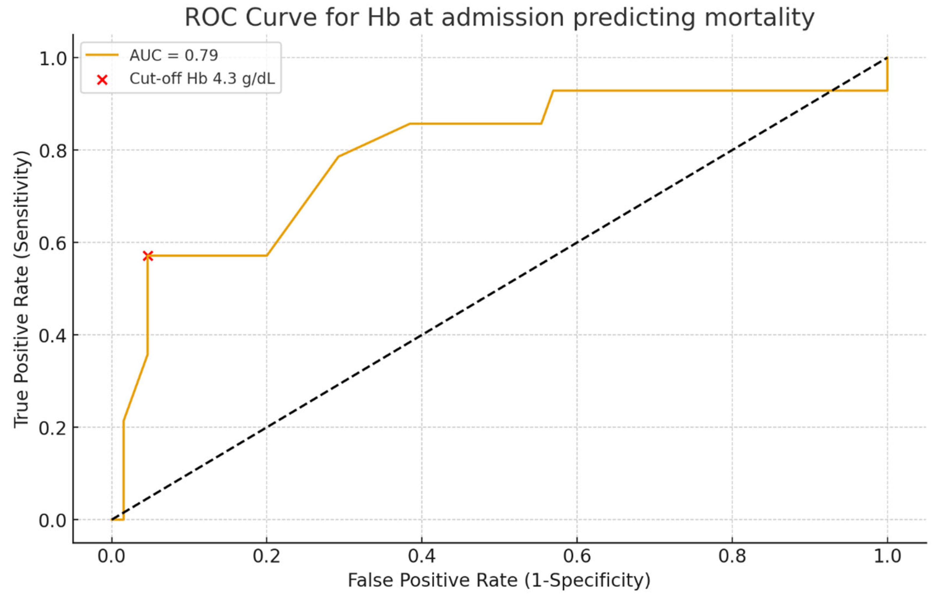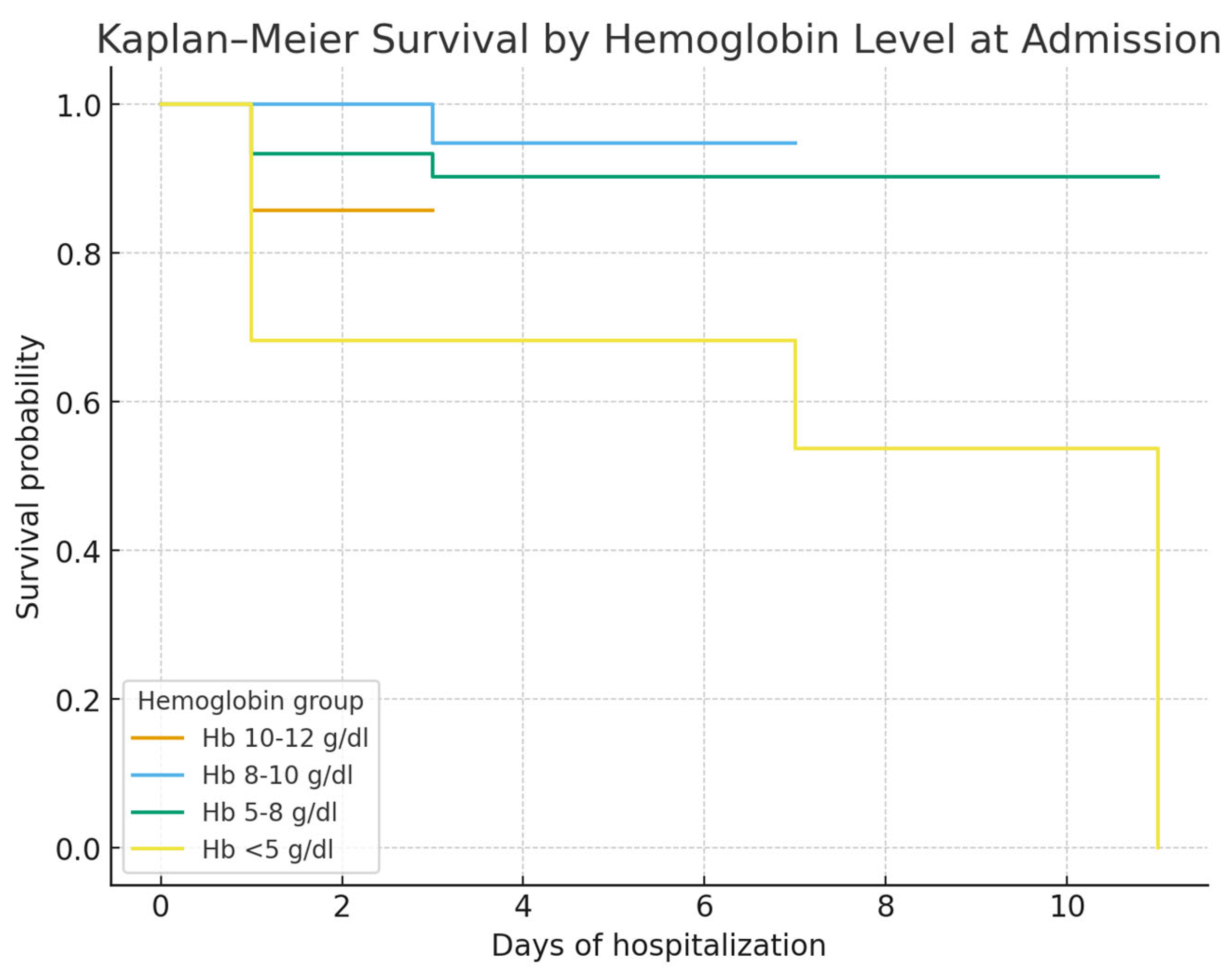 Hemoglobin on admission was a strong prognostic marker: patients with Hb < 5 g/dL had the poorest survival, consistent with the concept that profound anemia reflects uncontrolled bleeding and limited reserve. ROC curve analysis confirmed its discriminative value (AUC 0.79), though interpretation should consider other clinical factors [