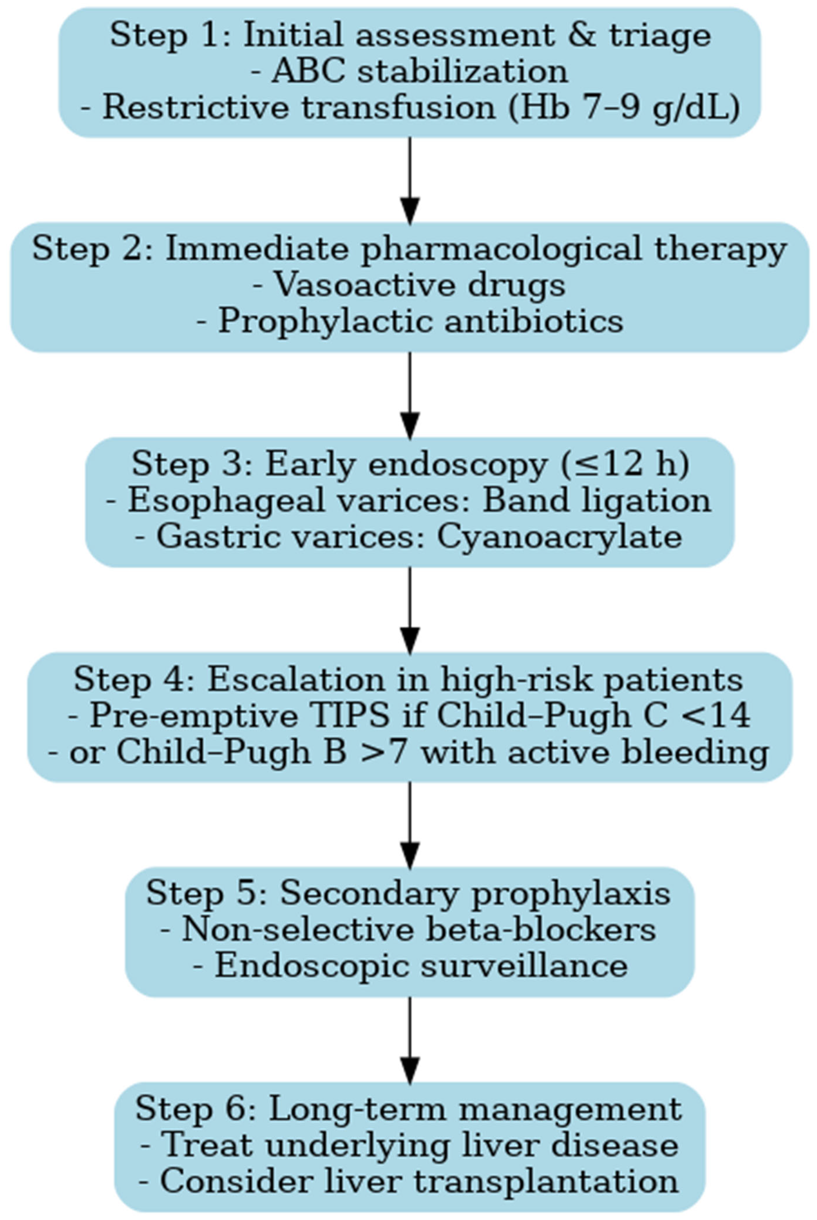 Early triage and resuscitation with restrictive transfusion—Patients should be rapidly identified at first contact and transferred to specialized centers whenever possible. Hemodynamic stabilization must be prioritized, with a restrictive transfusion strategy (target Hb 7–9 g/dL), as liberal transfusion has been associated with increased portal pressure and higher risk of rebleeding [