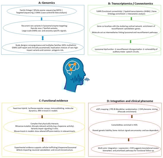 Overview of research topics and selected omic-related approaches to developmental stuttering. (Panel A) covers genomic study designs. (Panel B) presents transcriptomic and connectomic focus that spatially localize some relevant topics. (Panel C) depicts functional genomics evidence. (Panel D) displays omic integration approaches and clinical phenotypes. Arrows indicate potential research associations. Abbreviations and more detailed information are presented in the main text.