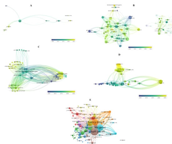 I also performed a bibliometric analysis using the Web of Science Core Collection, providing a comprehensive overview of scientific topics and key aspects related to stuttering within the omics context. Method details of this analysis are presented in Supplementary Materials File S1. Using VOSviewer software (version 1.6.20; Leiden, The Netherlands) [28] and a systematic examination of the publications, I generated Figure 2A–E, which include multiple graphs and illustrate the results indicating multiple research dimensions as well as emerging and relevant trends in this field.
