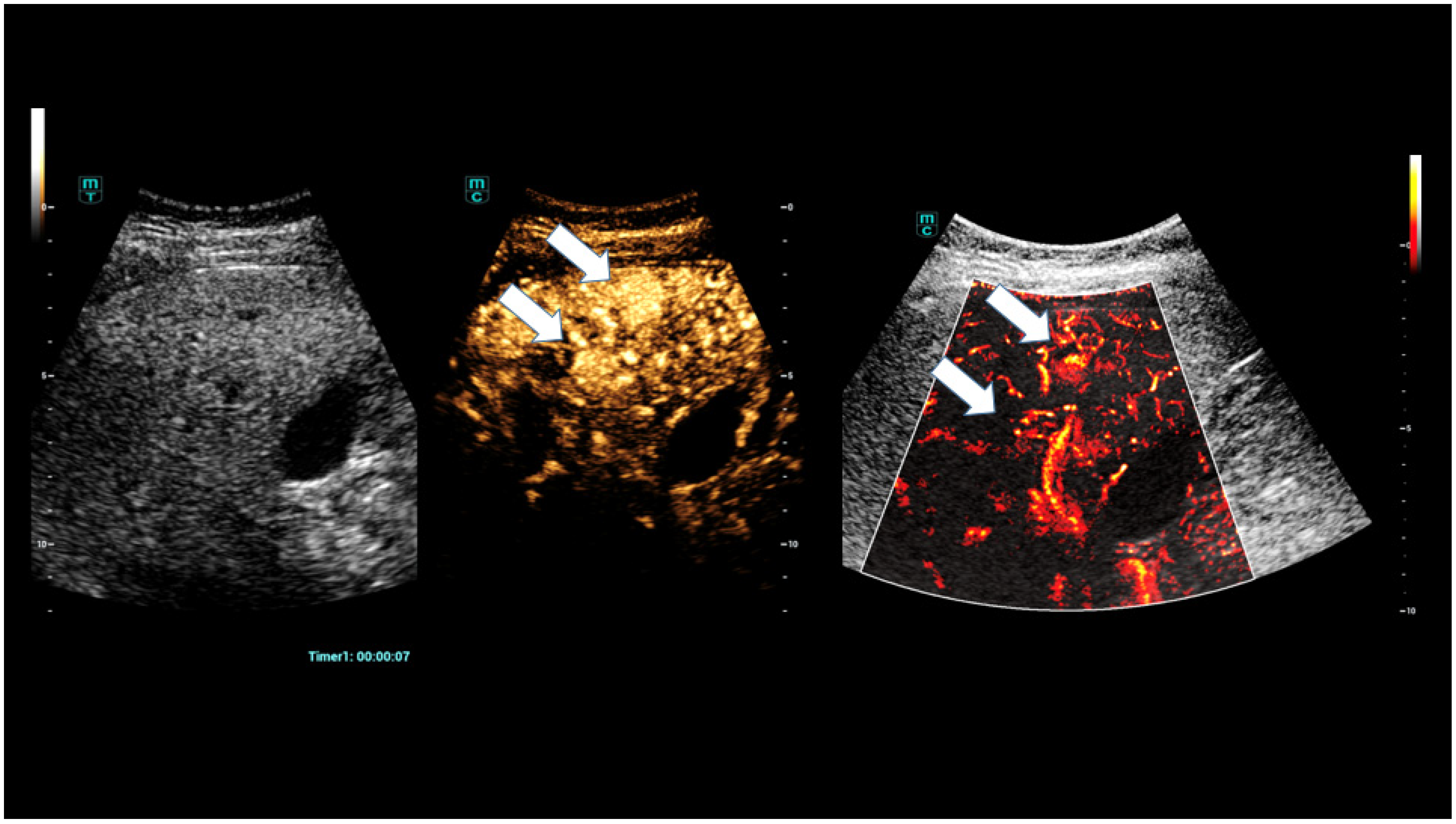Figure 1. CEUS and SR CEUS after injection of 1.4 mL ultrasound contrast agent with irregular hyperenhancement of the liver and early nodular enhancement of high-flow haemangiomas (arrows) and micro-shunts.