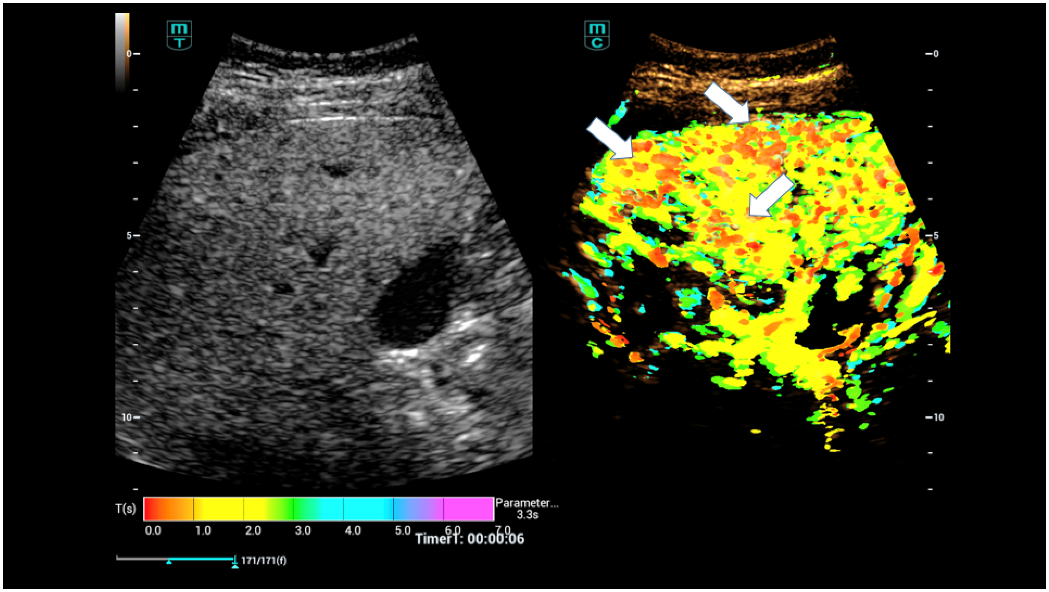 Figure 4. CEUS parametric evaluation after injection of 1.4 mL ultrasound contrast agent with irregular hyperenhancement of the liver and early nodular enhancement of high-flow haemangiomas (arrows) and micro-shunts with higher levels for time-to-peak (TTP) and area-under-the-curve (AUC).