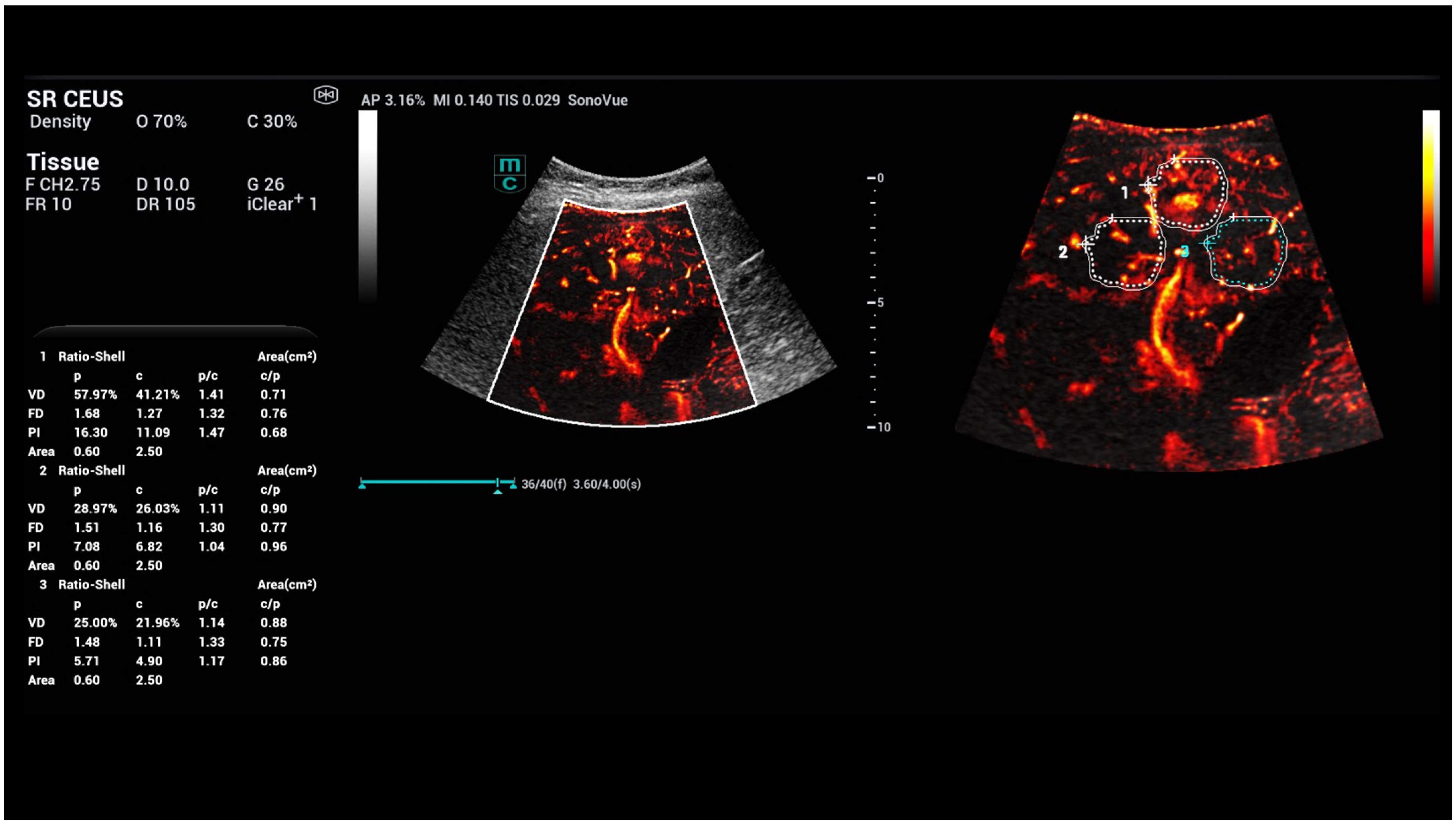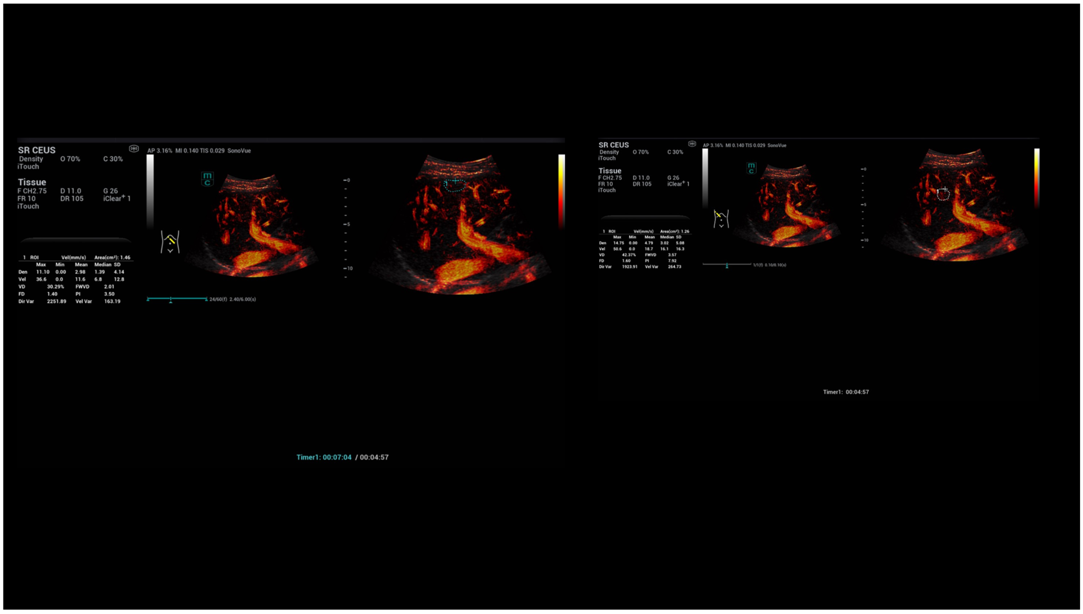 In order to be able to conclusively classify possible solid lesions, documentation was carried out in individual sequences up to a late phase of 6 min. During this latter contrast agent phase, sequences with Super-Resolution CEUS (SRCEUS) were also documented intermittently. This was to conclusively assess possible micro-shunts.