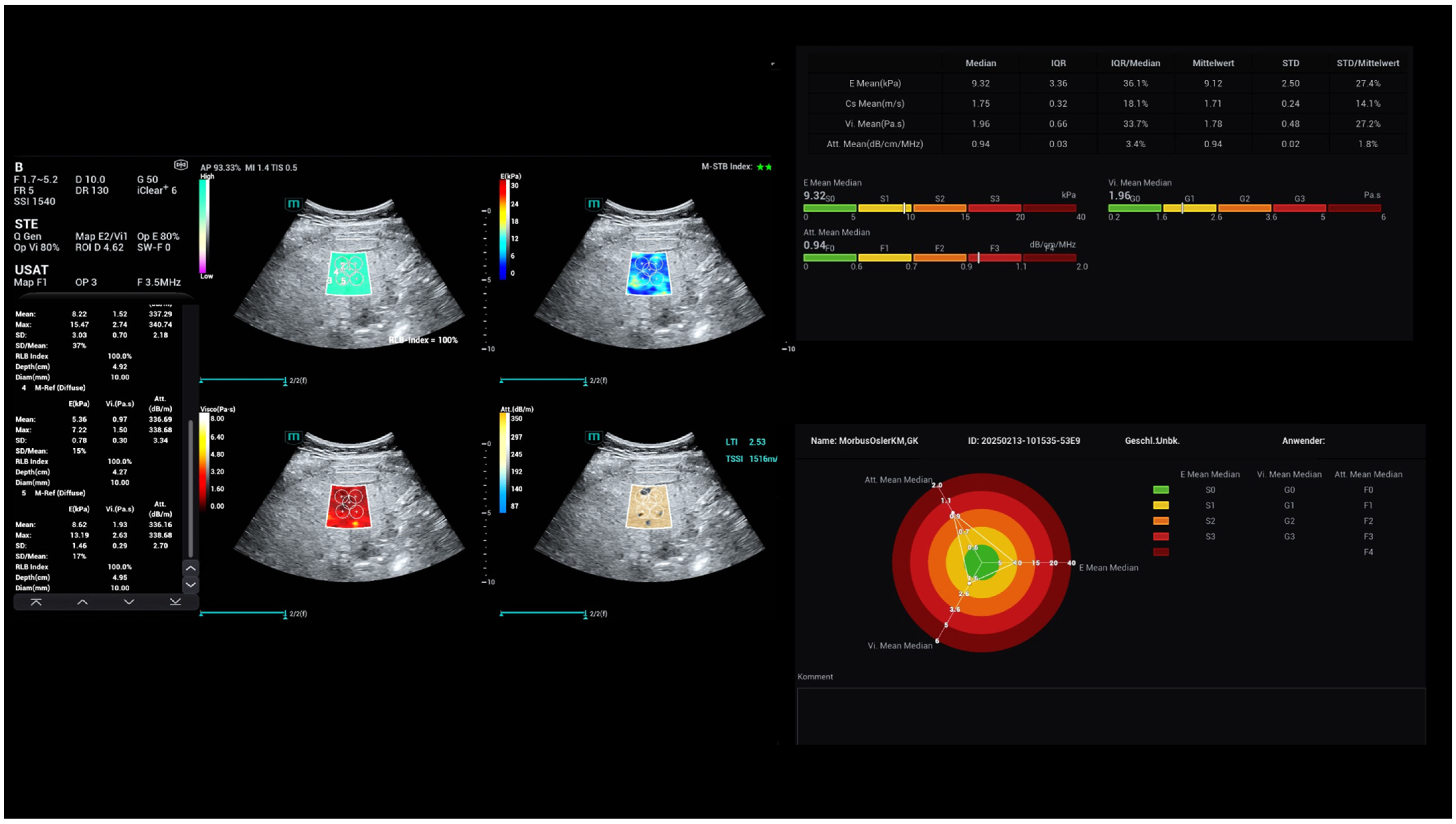 Multiparametric imaging also enabled the determination of liver compaction using shear wave elastography for liver stiffness evaluation. In addition, liver steatosis could be determined using the attenuation function (USAT) [1,2].
