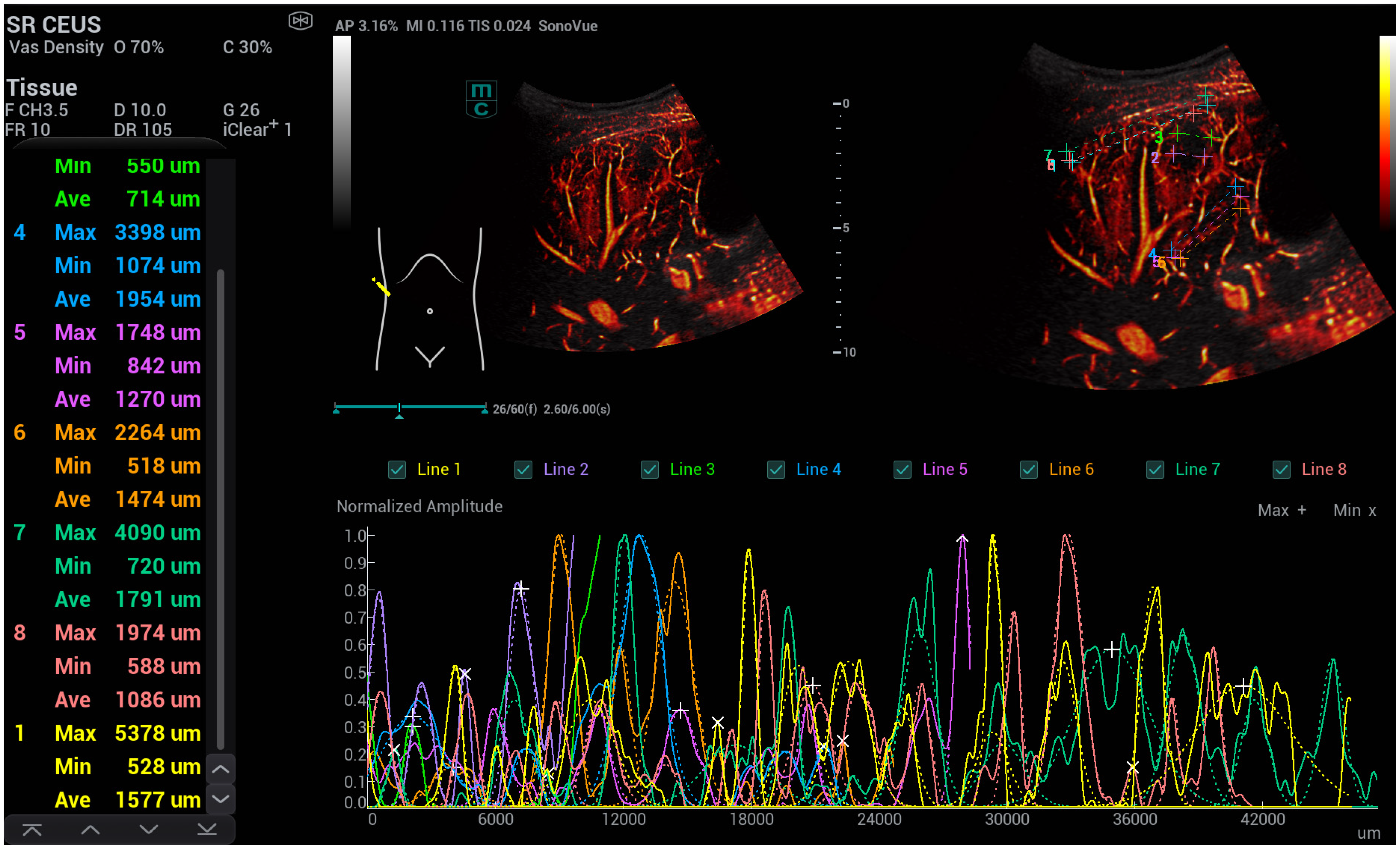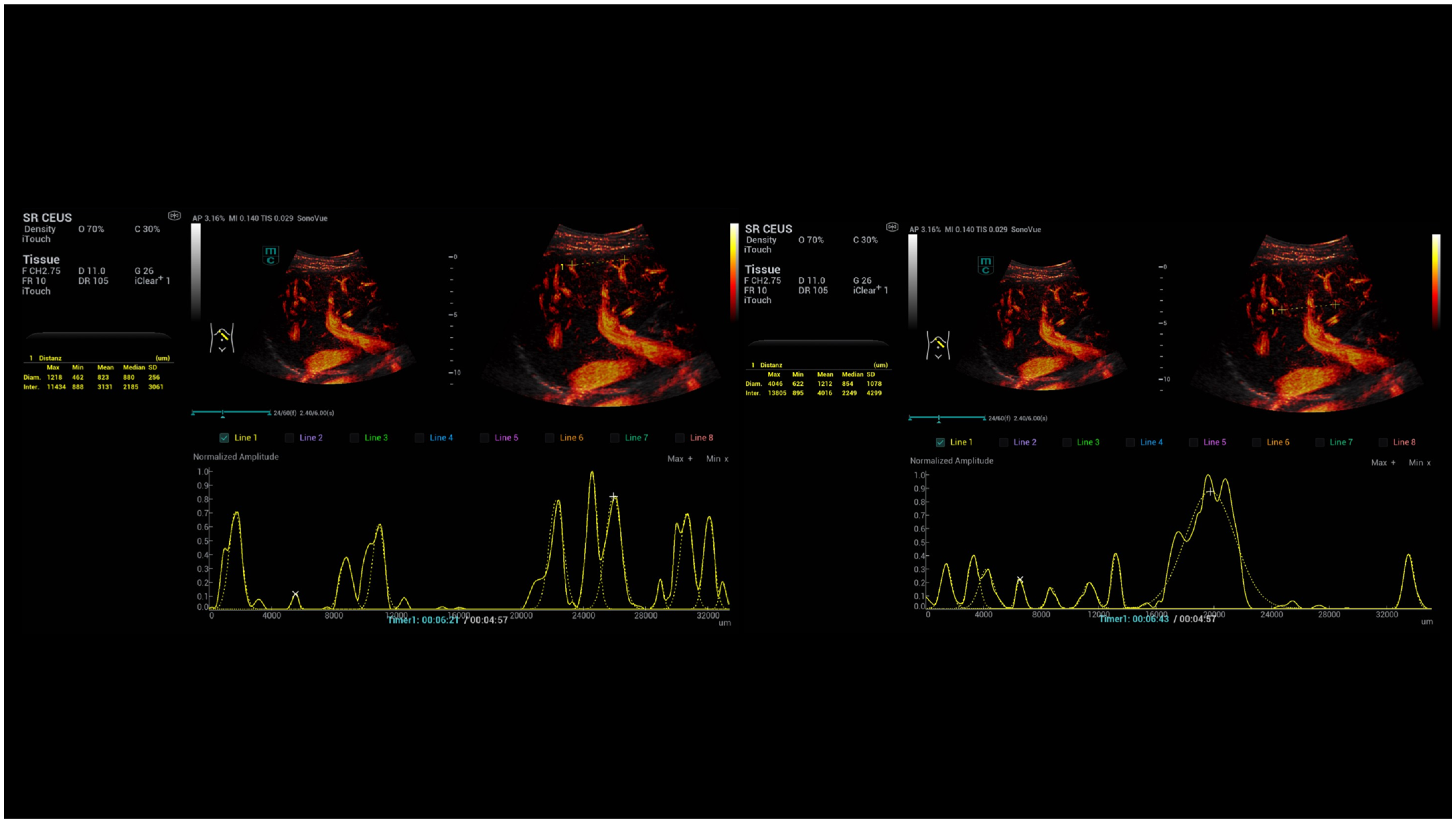 The detailed assessment of dynamics is also being expanded through accurate perfusion and dynamic evaluation of SR CEUS with four different tools, including dynamic, velocity, directional, and bi-directional (Figure 2).