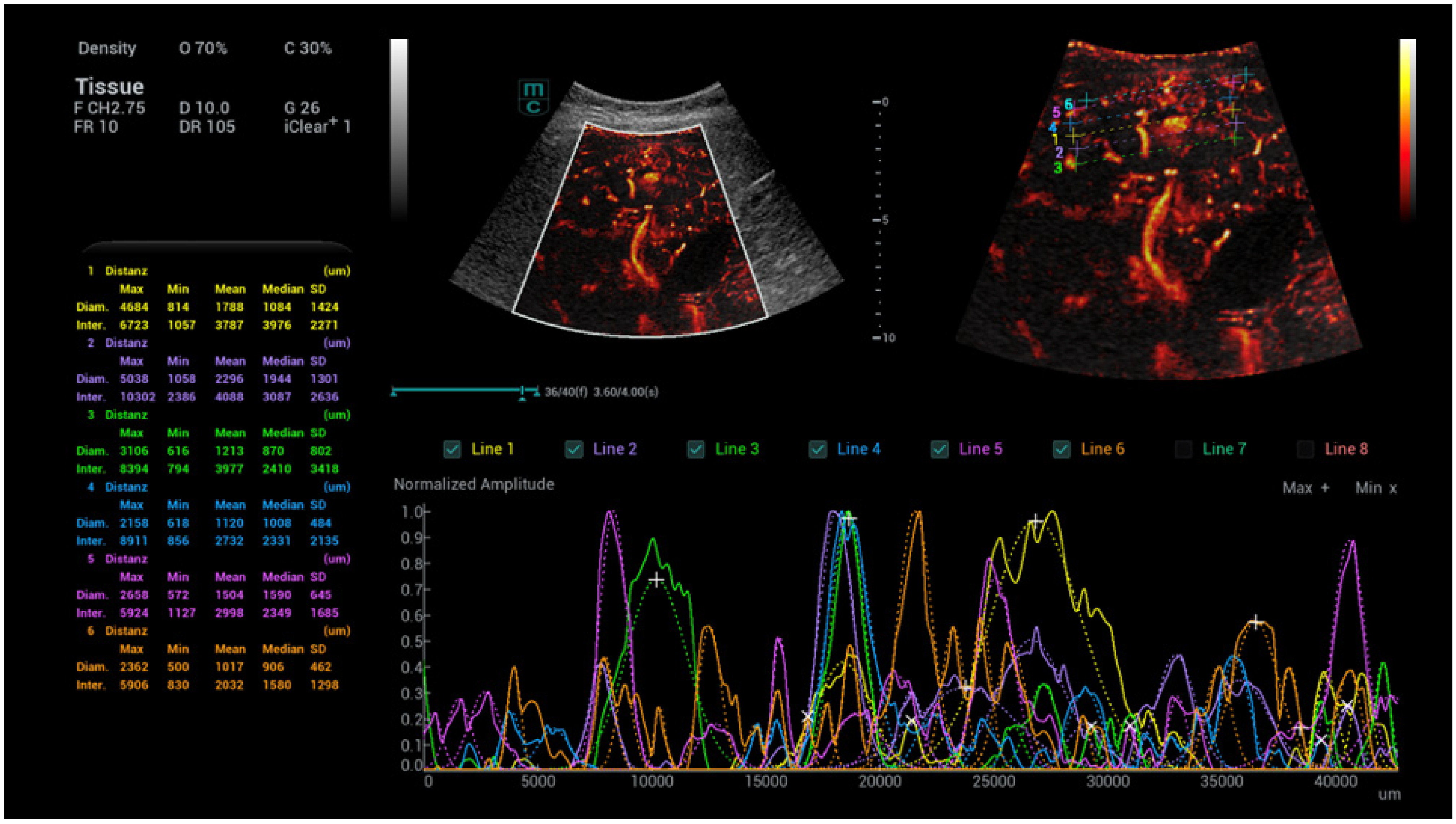 Figure 10. Diameter measurements of capillary vascalary structures near the liver capsular structure and in the center of the liver using a machine integradet SR CEUS quantification software. Independent evaluation by the stored dynamic SR CEUS cine loops over 5 s with manually adapted area’s near the capsular structures in comparison to the centre with peripheral capillary dilation in a case of Osler’s disease. CEUS in arterial phase after bolus injection of 2.0 mL ultrasound contrast agent (SonoVue) using a convex multifrequency probe (1–7 MHz).