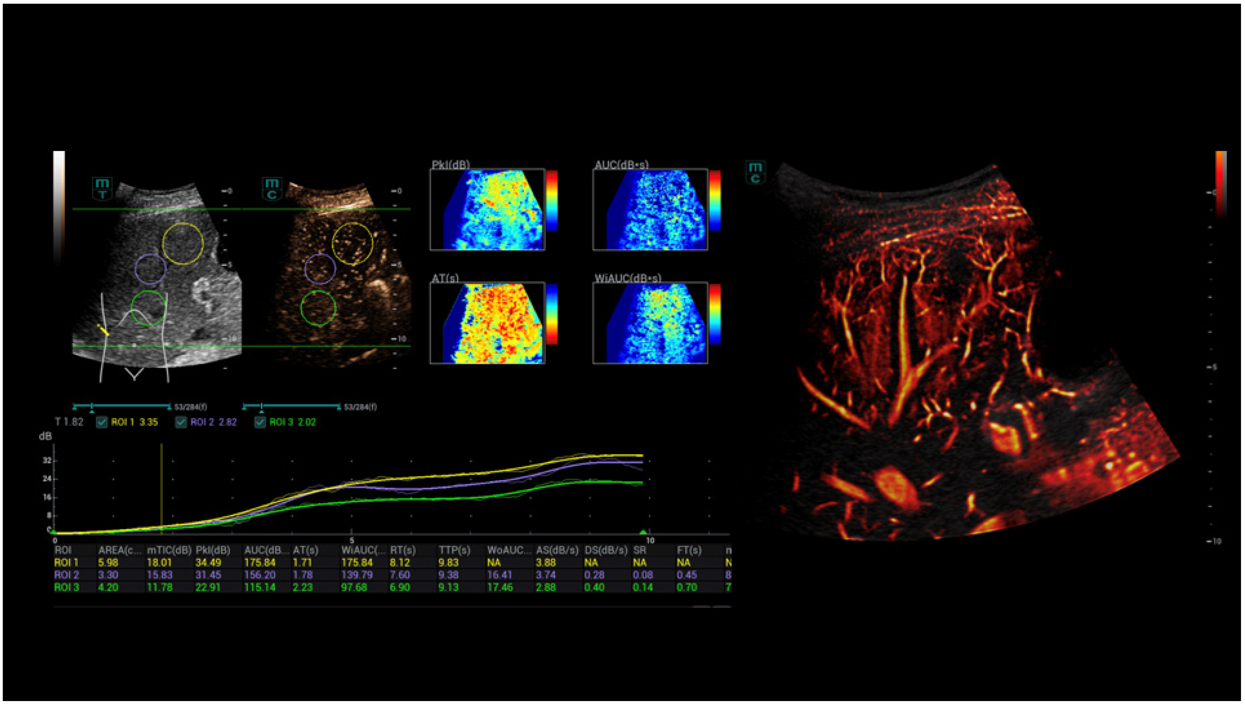 Figure 9. SR CEUS and CEUS perfusion and after injection of 1.4 mL ultrasound contrast agent with irregular hyperenhancement of the liver and early nodular enhancement of high-flow haemangiomas and micro-shunts. Visualisation of the early time–intensity curve (TIC) hyperenhancement of the shunts by dynamic SRCEUS (red and orange), as well as by colour maps of peak enhancement (PKI) and wash-in area-under-the-curve (WiAUC) (red and yellow).