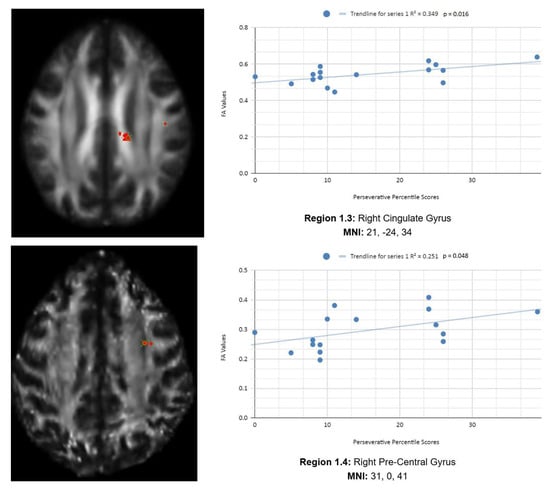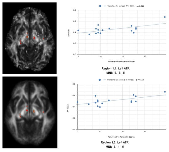 In the Ep category, two statistically significant positive correlations are displayed between perseverative percentile scores and FA values in the left and right frontotemporal and frontal–posterior white matter regions derived from positive z-maps. These regions include Regions 1.1 (Left ATR) and 1.2 (Left ATR) on the bottom left panel shown above. Regions 1.3 (right cingulate gyrus) and 1.4 (right precentral gyrus) are shown on the bottom right panel. The positive correlations in these specific regions suggest that as perseverative percentile scores decrease, FA values also decrease. DTI FA data are validated by WCST perseverative percentile score data in the ATR, cingulate gyrus, and precentral gyrus.
