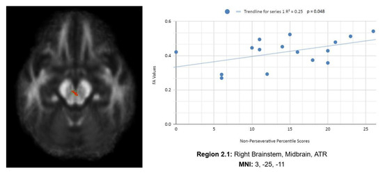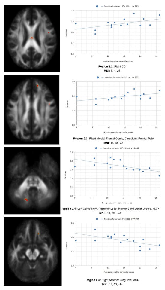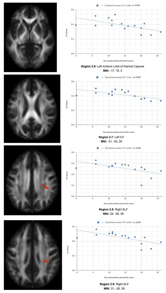 One overall positive correlation was also observed between non-perseverative (Enp) percentile scores and FA values in the left and right frontotemporal and frontal–posterior regions derived from negative Z-maps (0). These regions include Regions 2.1 (Right Brainstem, Midbrain, ATR), 2.2 (Right CC), and 2.3 (Right Medial Frontal Gyrus, Cingulum, Frontal Pole), which were correlated together in the bottom right panel.This overall positive correlation means that as non-perseverative percentile scores decrease, so do FA values. DTI FA data are validated by WCST non-perseverative percentile scores.