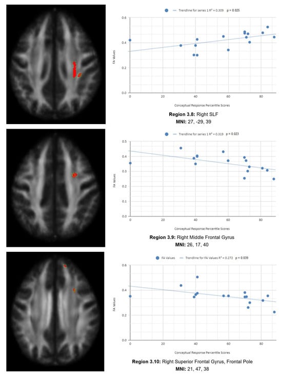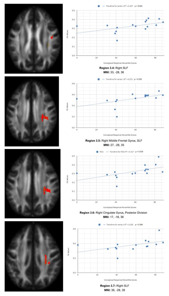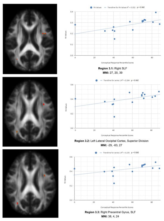 Figure 3 shows transaxial images of key brain regions of interest, including the right SLF, right cingulate gyrus, and left lateral occipital cortex, superior division. These regions are correlated with reduced FA values and reduced CResp percentile scores using Excel (Region 3.1, R2 = 0.352, p = 0.042; Region 3.2, R2 = 0.264, p = 0.042; Region 3.3, R2 = 0.235, p = 0.042; Region 3.4, R2 = 0.257, p = 0.045; Region 3.5, R2 = 0.271, p = 0.039; Region 3.6, R2 = 0.317, p = 0.039; Region 3.7, R2 = 0.255, p = 0.046; Region 3.8, R2 = 0.309, p = 0.025; Region 3.9, R2 = 0.319, p = 0.023; Region 3.10, R2 = 0.272, p = 0.039).