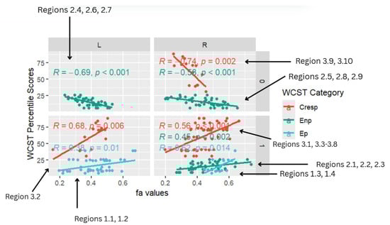 Figure 4 is a facet scatterplot produced in R Studio. It compiles all the statistically significant data points and correlations into one medium and summarizes the entire multi-linear regression analysis. Panels on the left side show regions in the left (L) frontal–temporal and frontal–posterior white matter regions, while panels on the right-side show regions in the right (R) frontal–temporal and frontal–posterior regions. The topmost panels show regions mapped using negative z-maps (0) and the bottom panels show regions mapped using positive z-maps (1). In each panel, WCST percentile scores from each WCST covariate (CResp, Ep, and Enp) are displayed in correlation with FA values at a specific brain region (L/R) that was mapped out from a specific kind of z-map (0/1).
