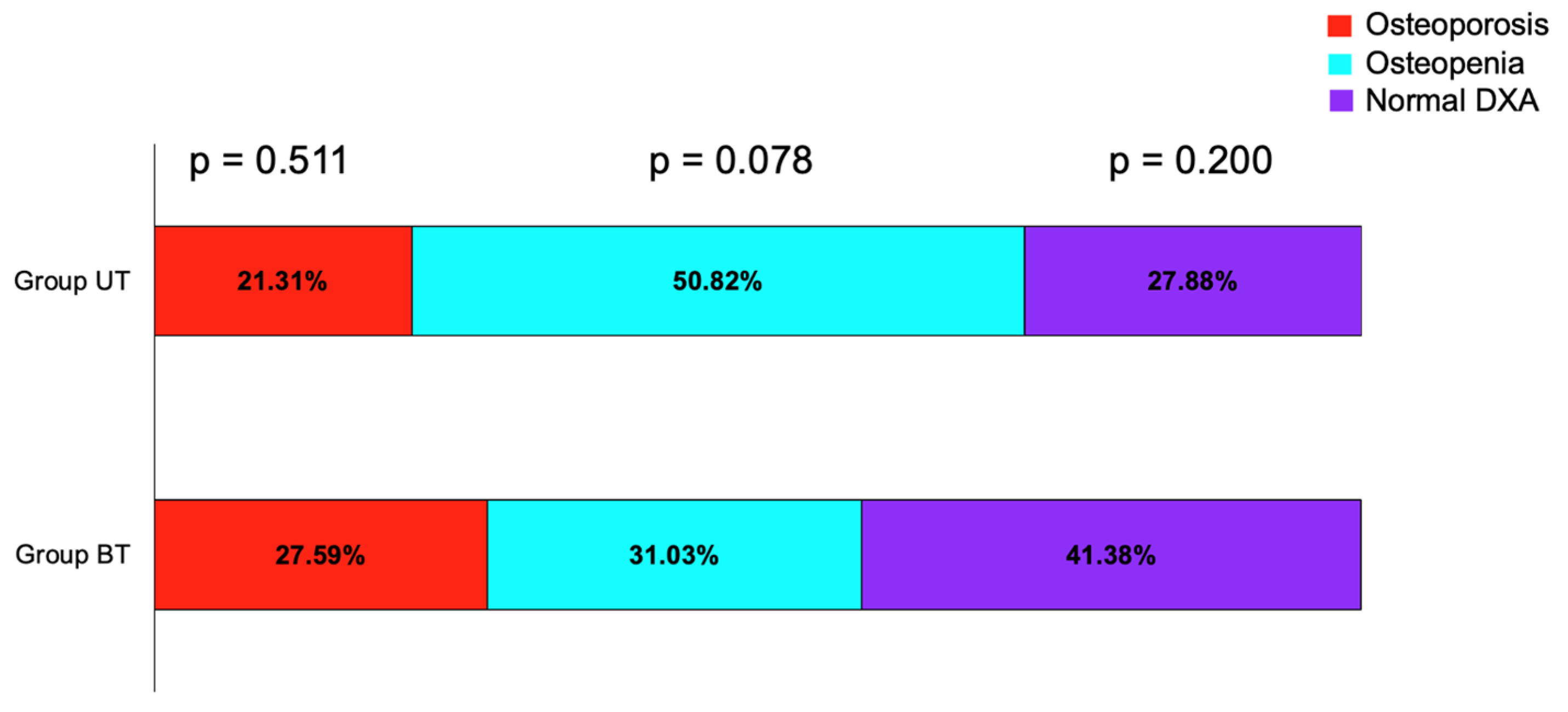 | Parameter | UT Group (N = 18, 54.55%) | BT Group (N = 15, 45.45%) | p-Value | UT Group (N = 70, 72.92%) | BT Group (N = 26, 27.08%) | p-Value |